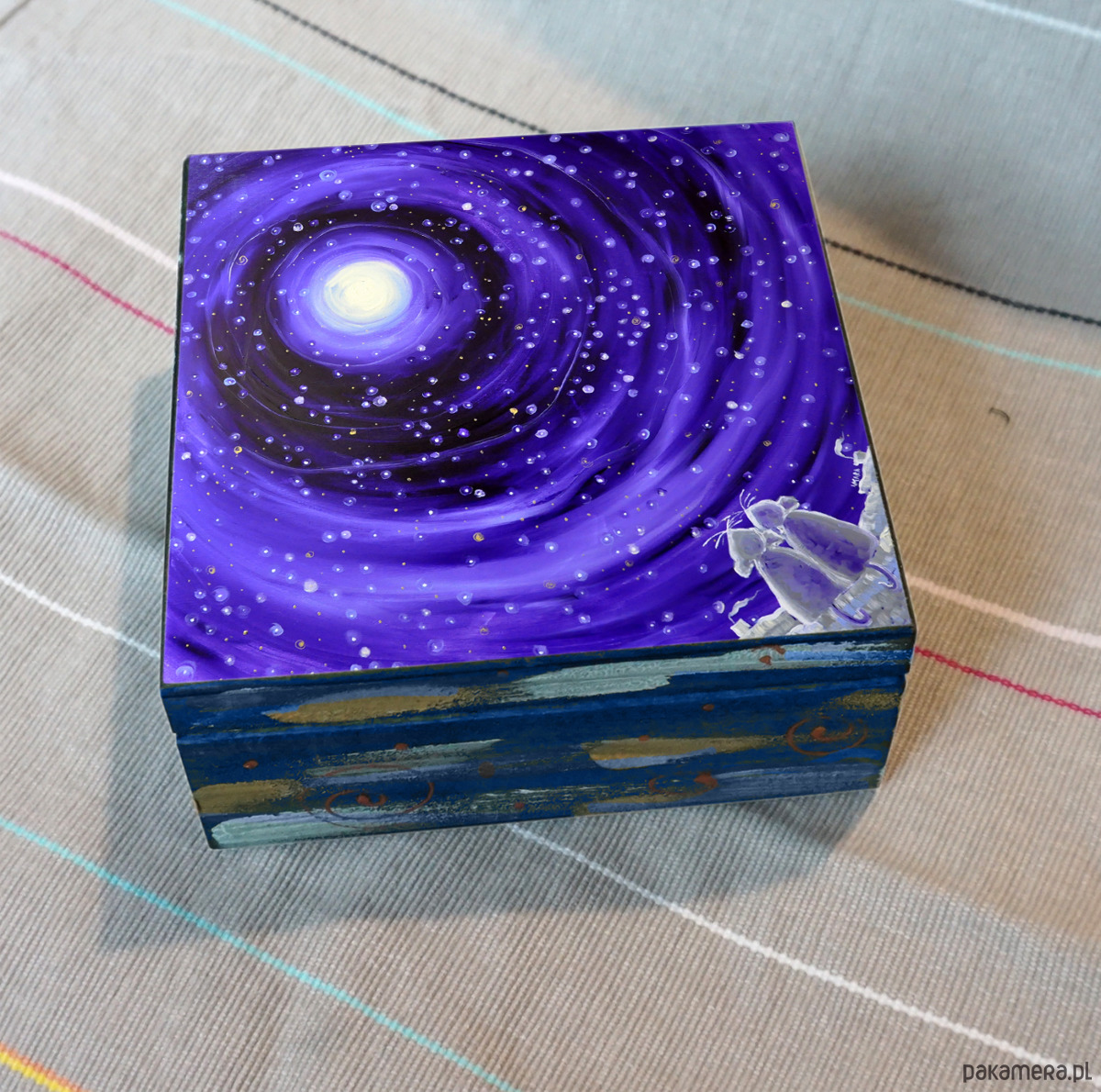 Drewniane pudełko decoupage z reprodukcją obrazu autorskiego, noszącego tytuł „Szczęście gwiazd”.
