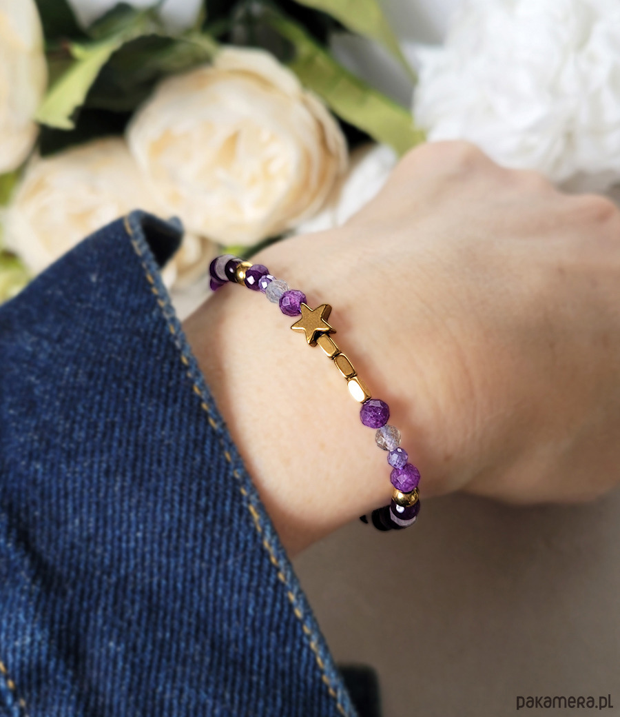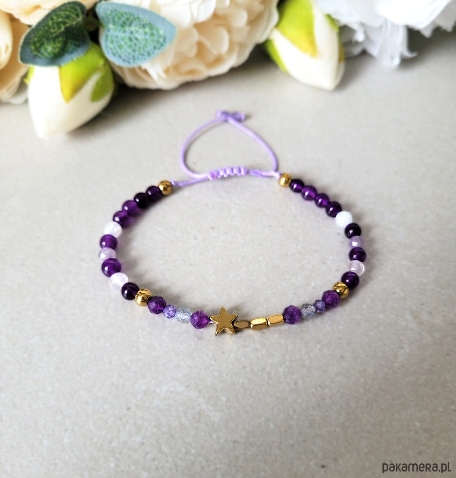 Bransoletka zrobiona z kamieni naturalnych: Ametystu, Kam. księżycowego, Labradorytu, Kwarcu różowego, Hematytu oraz cudownie mieniących się Cyrkonii.