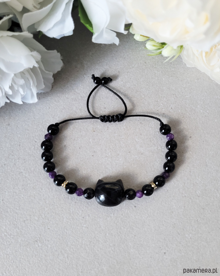 Bransoletka zrobiona z kamieni naturalnych: Obsydianu, Ametystu, Onyksu.