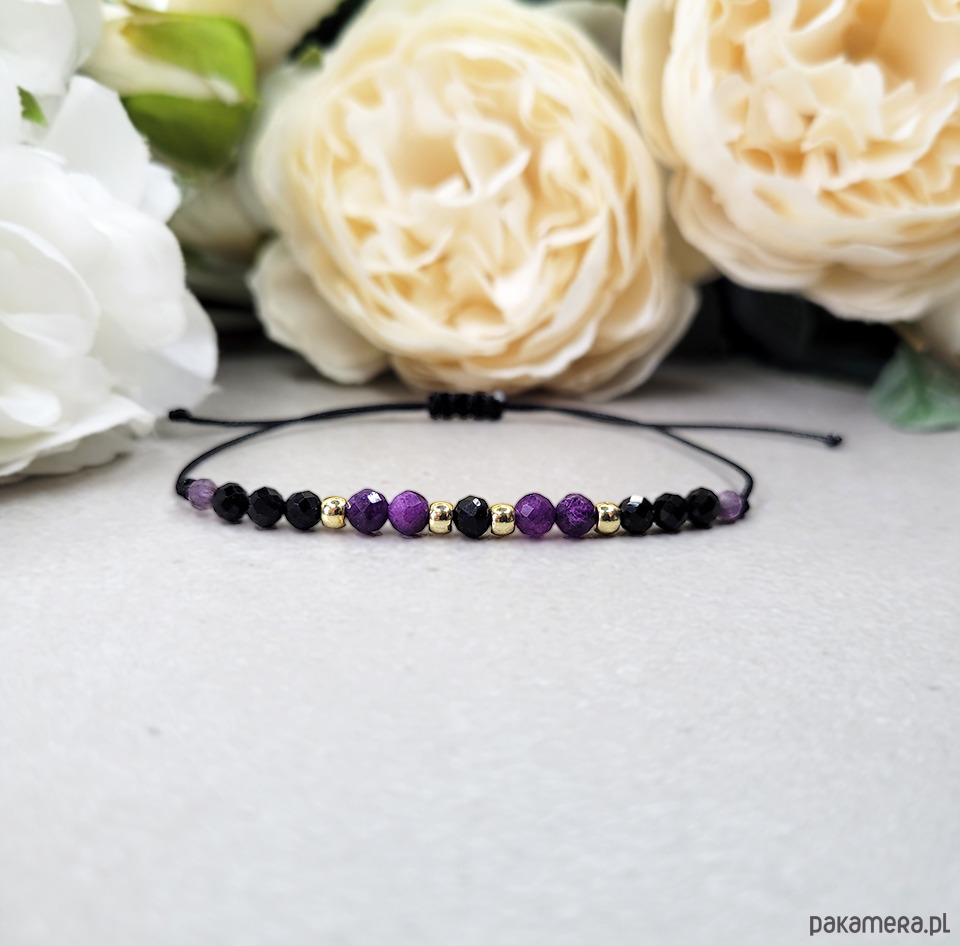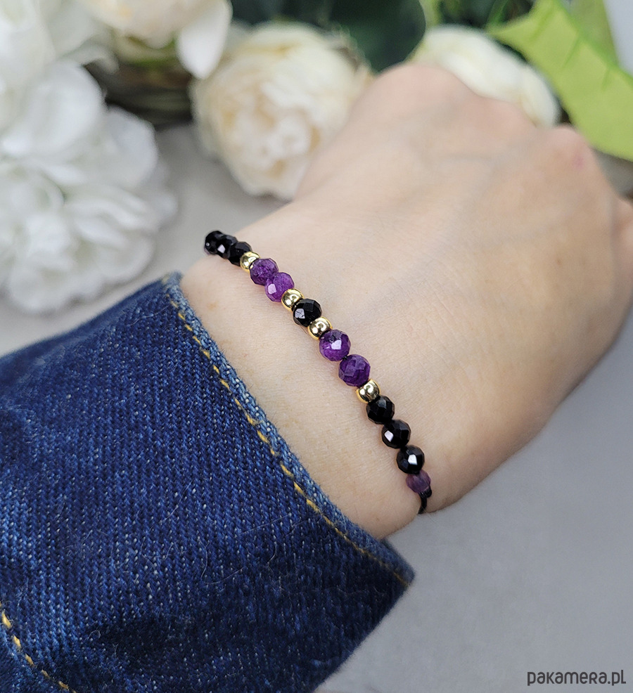 Przepiękna delikatna bransoletka zrobiona z kamieni naturalnych: Turmalinu, Ametystu, Spinelu i Hematytu w kolorze złota.