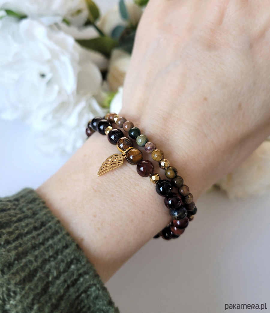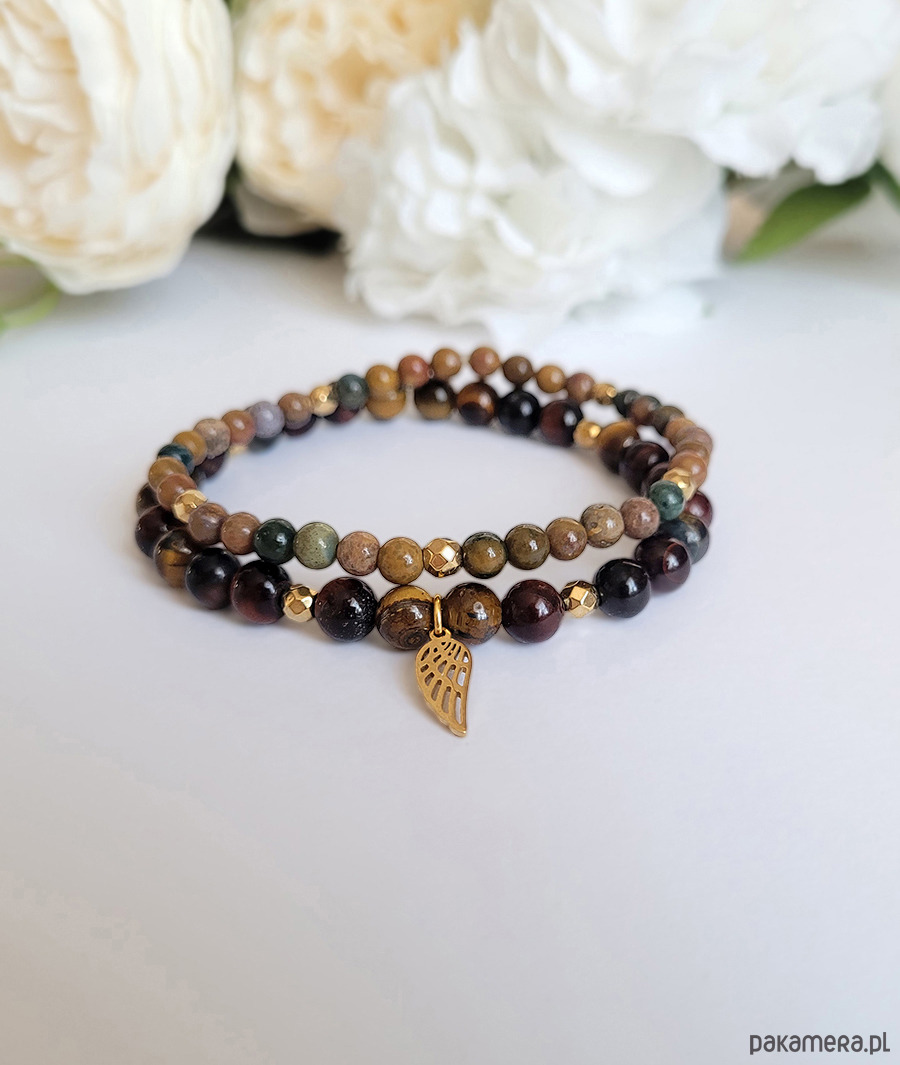 Piękny zestaw dwóch bransoletek zrobiony z kamieni naturalnych: Tygrysiego oka, Jaspisu oceanicznego oraz Hematytu w kolorze złota.