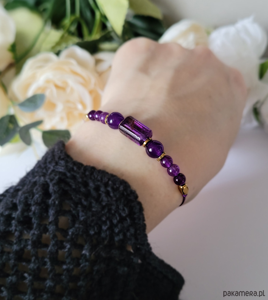 Piękna bransoletka zrobiona z kamieni naturalnych: Ametystu oraz Hematytu.
