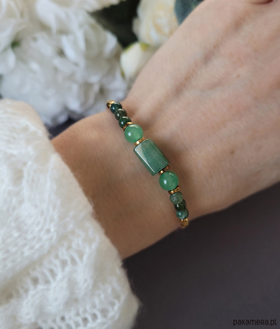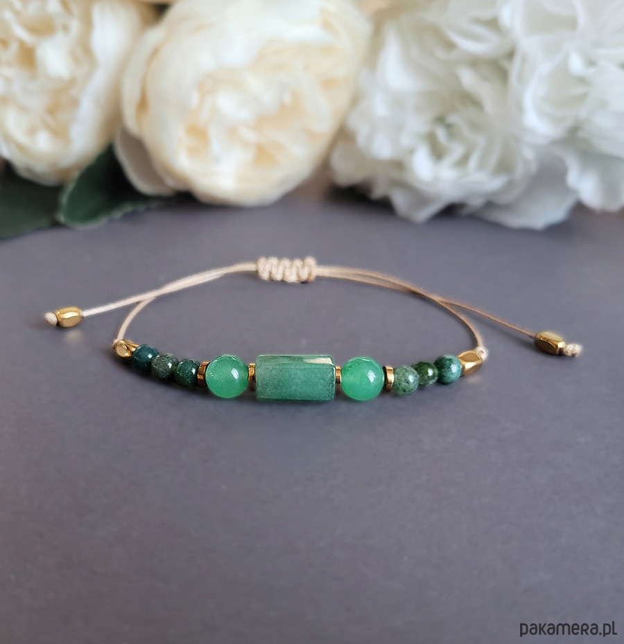 Piękna bransoletka zrobiona z kamieni naturalnych: Awenturynu, Agatu Indyjskiego oraz Hematytu.