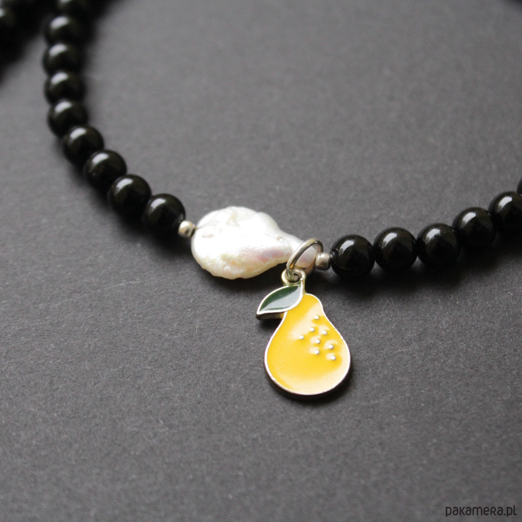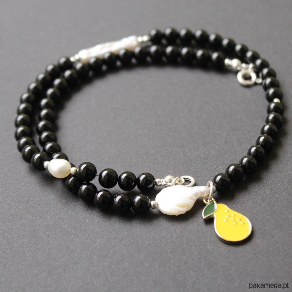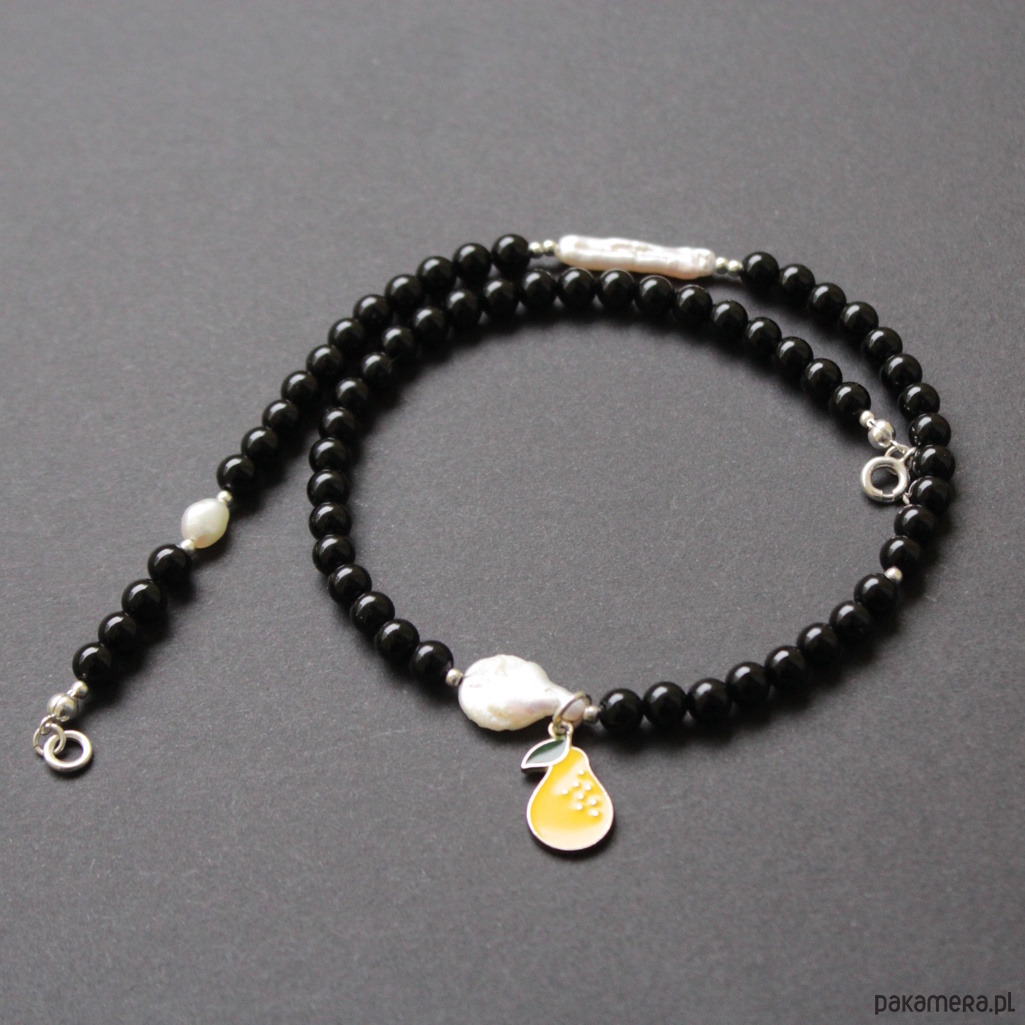 Oryginalny naszyjnik wykonany zostały z kuleczek onyksu (0,7 cm) w towarzystwie naturalnych perełek hodowlanych wielkości 0,6-3 cm.