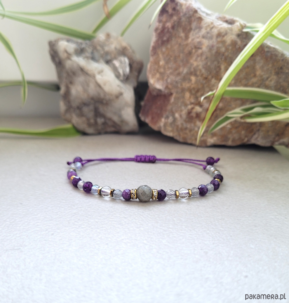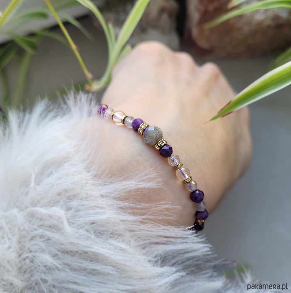 Przepiękna bransoletka zrobiona z kamieni naturalnych: Labradorytu, Ametystu, Kryształu górskiego oraz Hematytu.