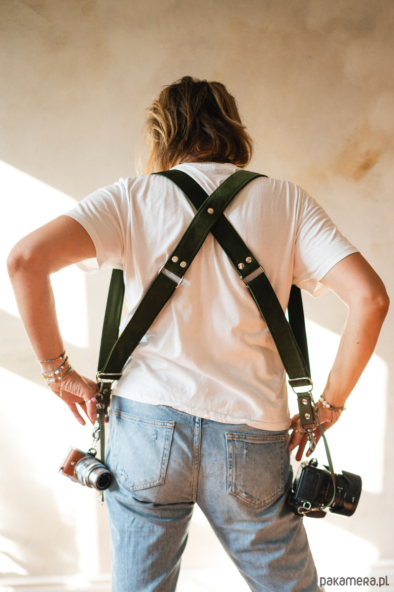 Szelki reporterskie dla fotografki welurowe zieleń butelkowa