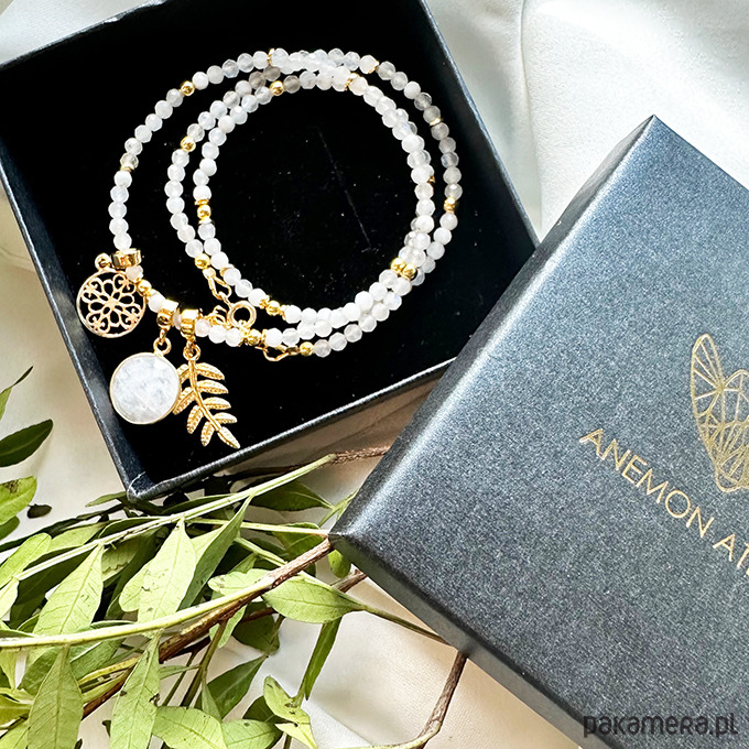 Szept Księżyca-Delikatny naszyjnik z naturalnych kamieni księżycowych lśniących w odcieniach bieli . Trzy zawieszki dodają mu uroku i symbolicznej głębi, a możliwość ich zmiany pozwala tworzyć biżuterię dopasowaną do nastroju. To wyjątkowy dodatek, który łączy w sobie magię kamieni i kobiecą subtelność. Biżuteria może być noszona w wersji z trzema zawieszkami, jedną wybraną lub całkowicie bez nich, zachowując elegancki i minimalistyczny wygląd.