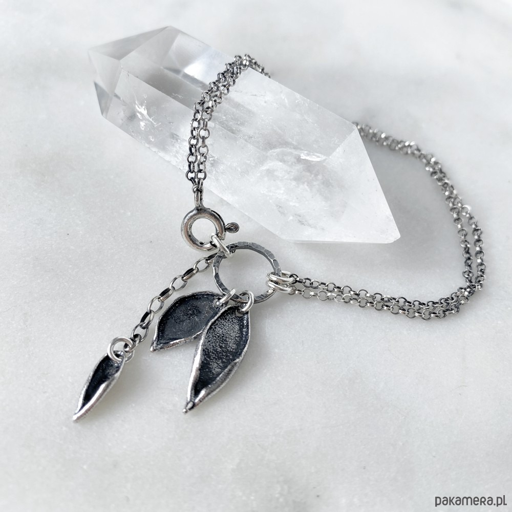 Całość skąpana w delikatnej oksydzie (przyciemniona) i ręcznie wypolerowana, przez co biżuteria nabrała głębi i niepowtarzalnego charakteru.