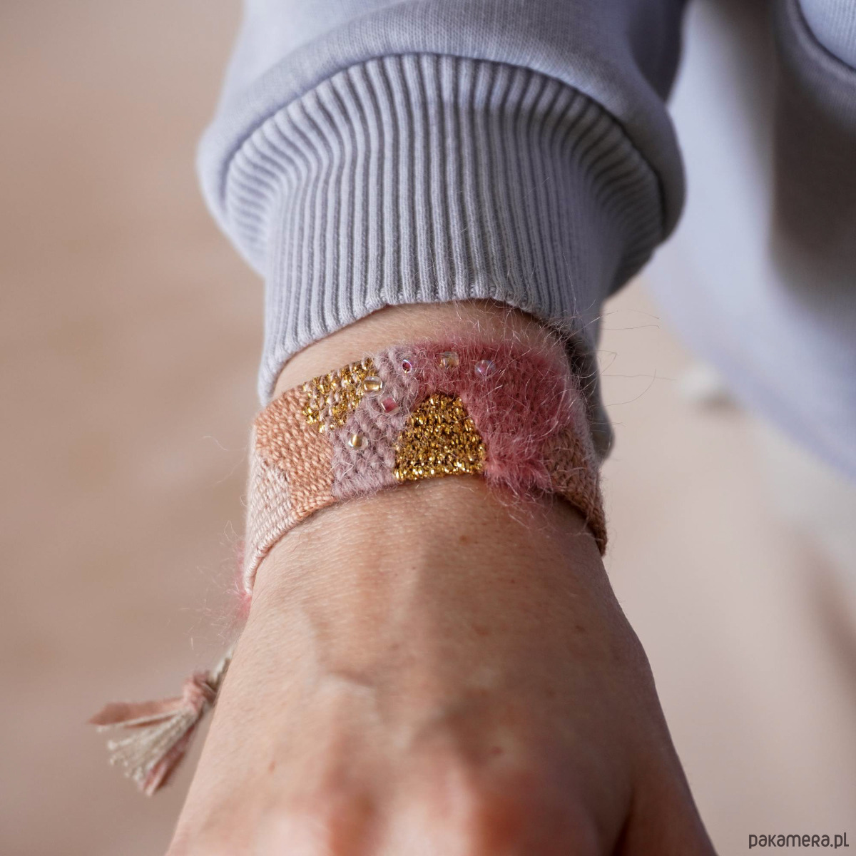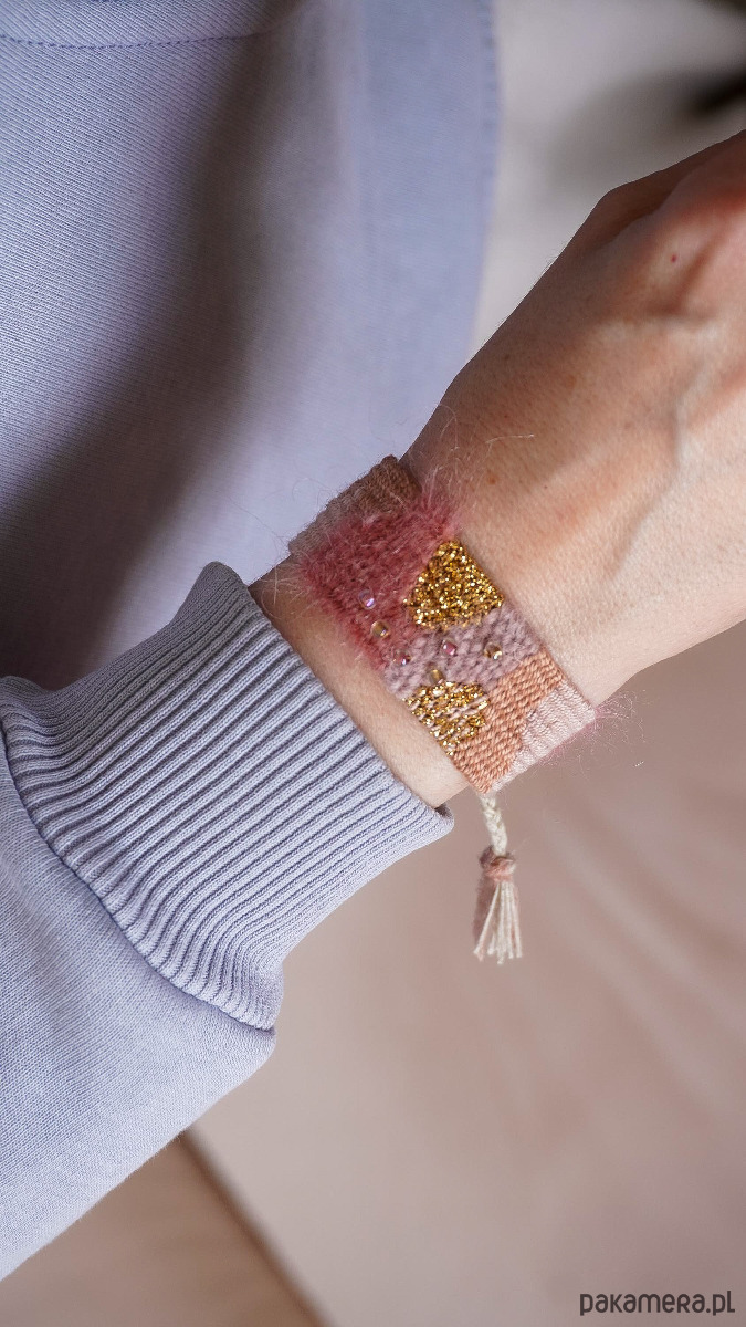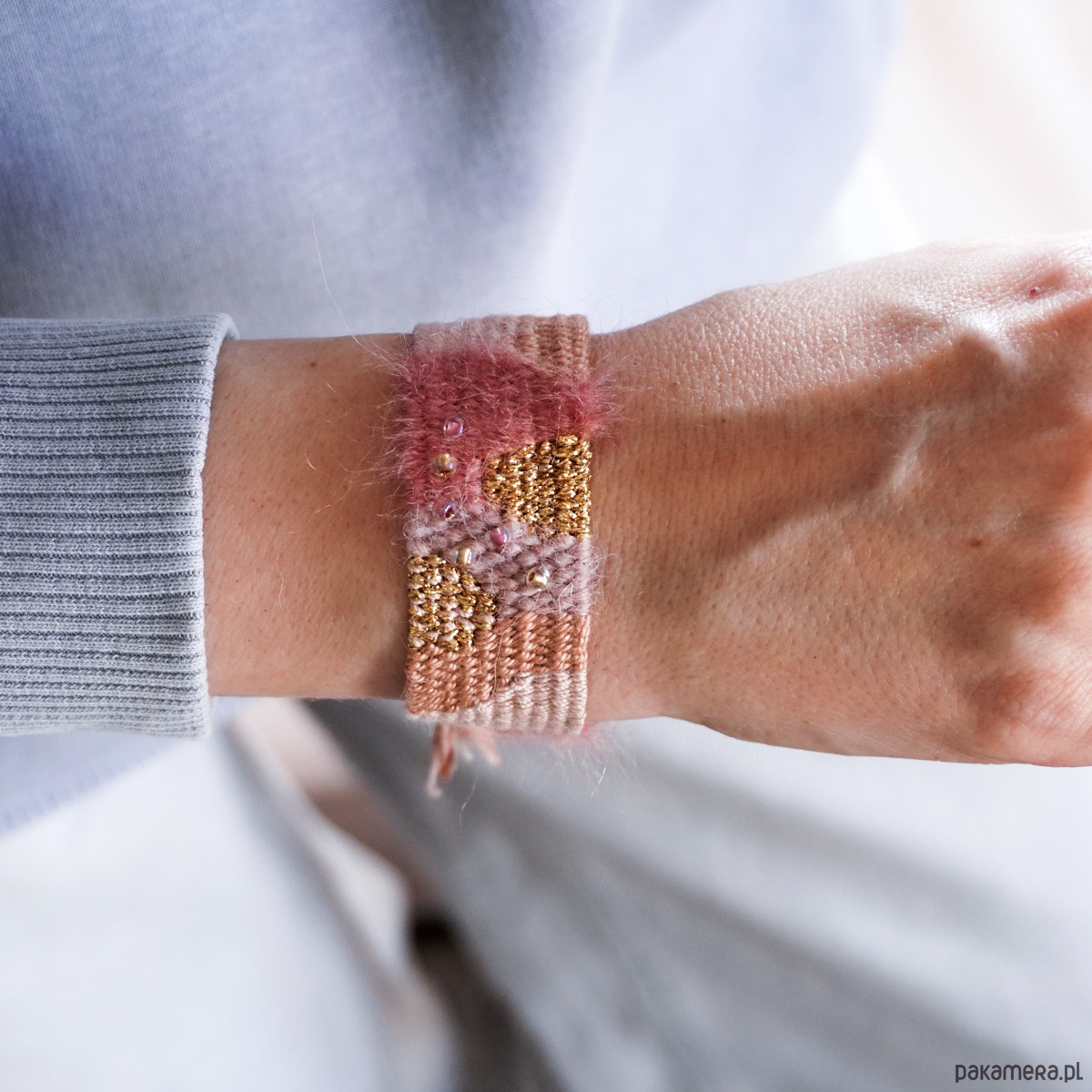 Przepiękna, szeroka bransoletka ręcznie robiona. Bransoletkę wiąże się samodzielnie na supełek. Poza błyszczącą nitką, w całości wykonana jest z naturalnych nici takich jak: len, bawełna, wełna, jedwab, moher. Dodatkowo jest ozdobiona koralikami szklanymi. Szerokość bransoletki to około 2,5 cm a długość części tkanej około 14,5 cm - 15 cm. Dochodzą oczywiście sznureczki dzięki którym bransoletka bedzie dobra również na trochę szersze obwody nadgarstka. W razie pytań proszę o kontakt :)