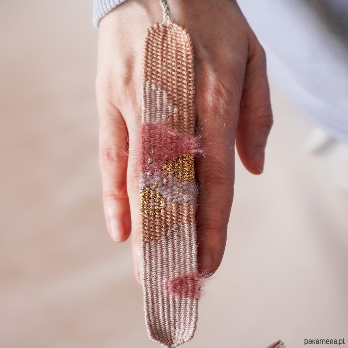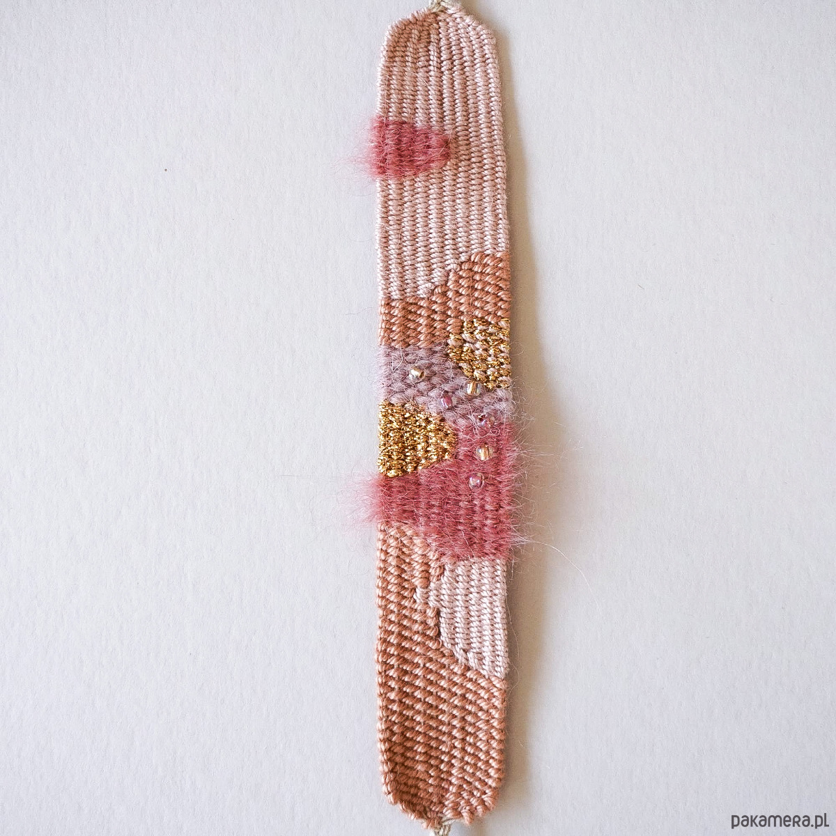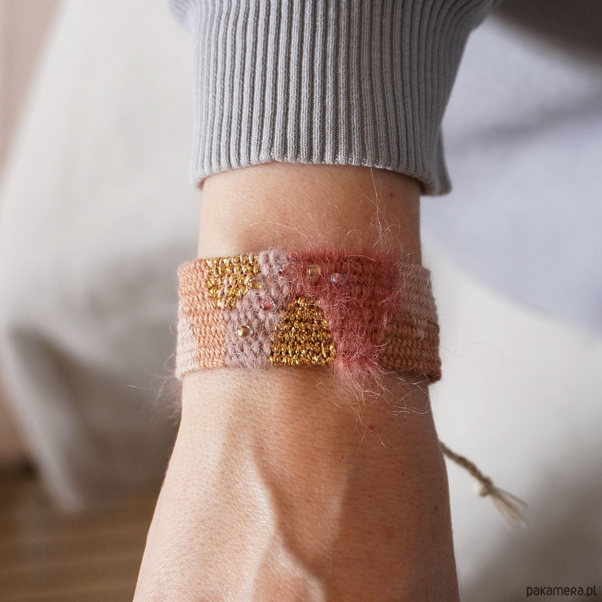 Przepiękna, szeroka bransoletka ręcznie robiona. Bransoletkę wiąże się samodzielnie na supełek. Poza błyszczącą nitką, w całości wykonana jest z naturalnych nici takich jak: len, bawełna, wełna, jedwab, moher. Dodatkowo jest ozdobiona koralikami szklanymi. Szerokość bransoletki to około 2,5 cm a długość części tkanej około 14,5 cm - 15 cm. Dochodzą oczywiście sznureczki dzięki którym bransoletka bedzie dobra również na trochę szersze obwody nadgarstka. W razie pytań proszę o kontakt :)