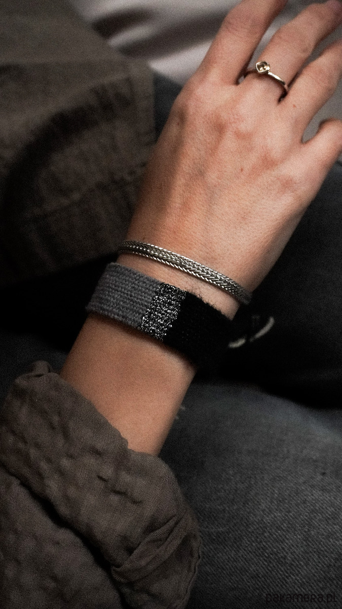 Unikatowa bransoletka ręcznie robiona. Prosta, minimalistyczna, elegancka i rockowa jednocześnie. Szerokość około 2 cm, długość części tkanej około 15 cm. Dochodzą sznureczki do samodzielnego wiązania. Polecam serdecznie ♡