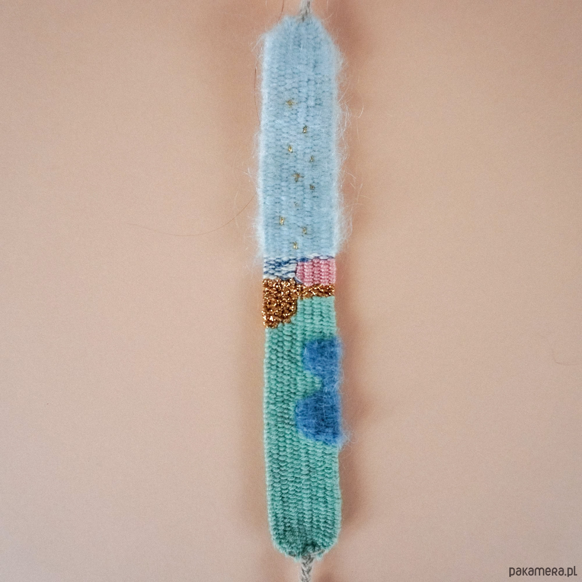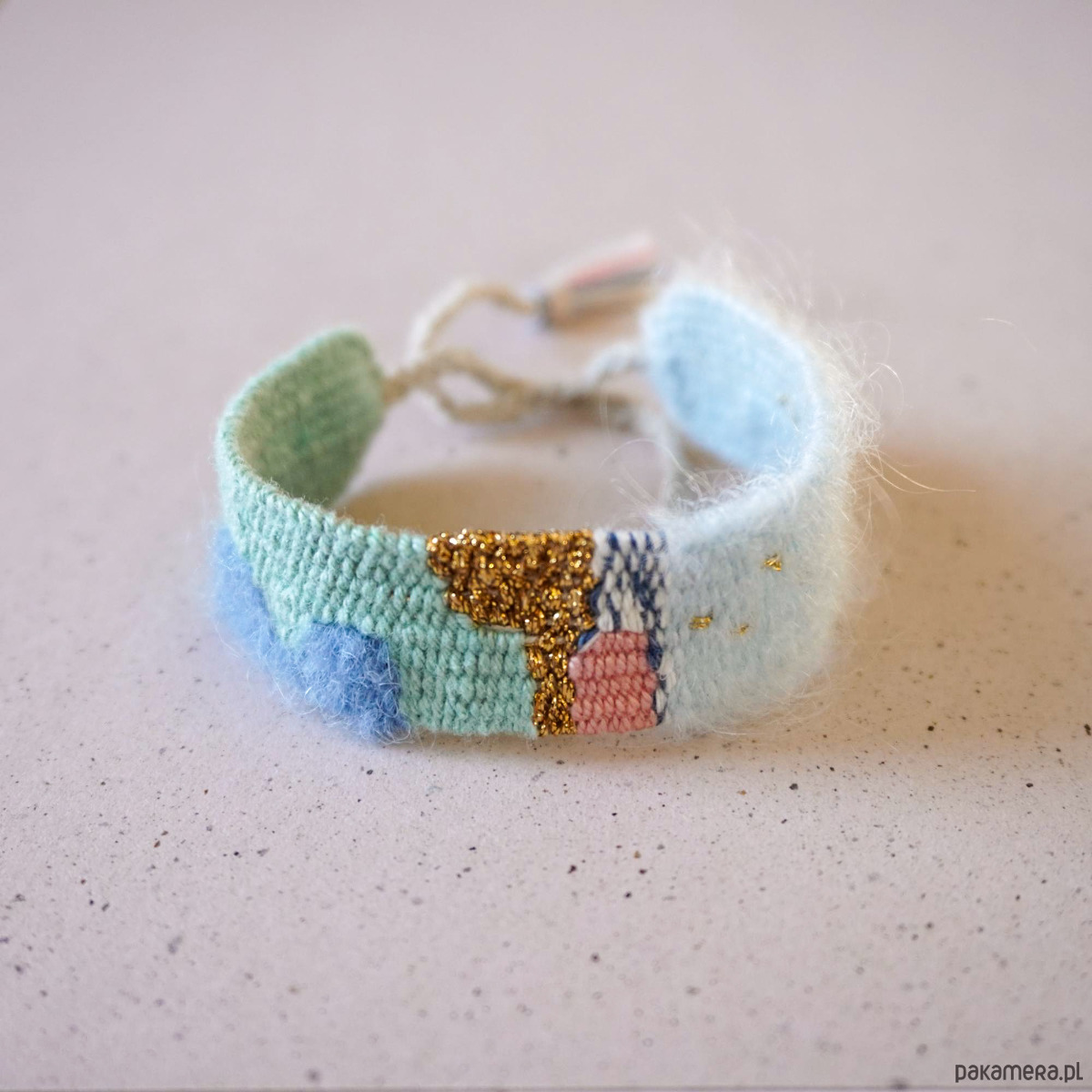 Piękna, absolutnie wyjątkowa bransoletka ręcznie wykonana na krośnie. Idealna dla miłośników kolorystyki aqua 🩵. Szerokość około 2 cm, długość części tkanej około 15 cm. Dochodzą sznureczki do samodzielnego wiązania. Cudo. Polecam serdecznie ♡