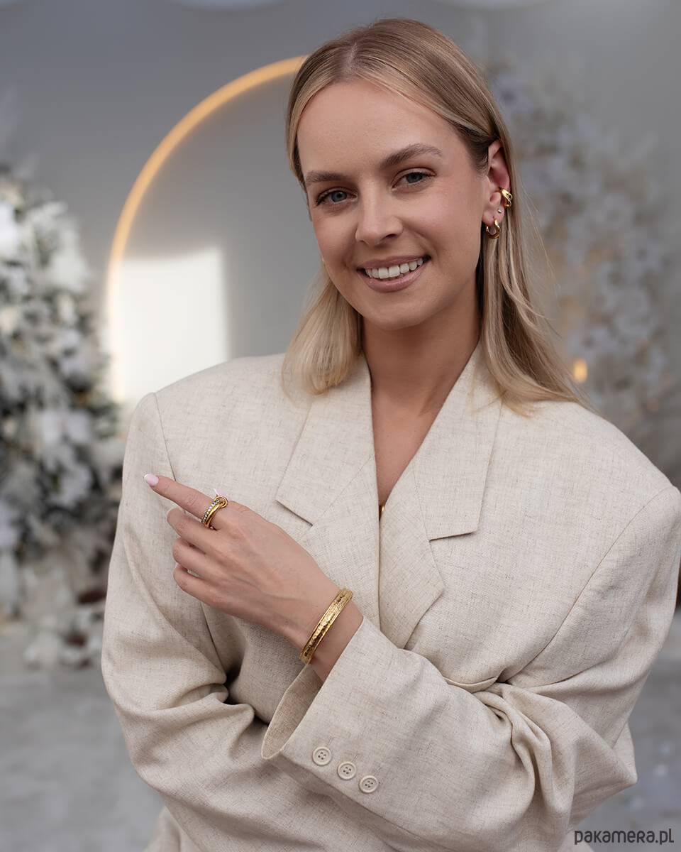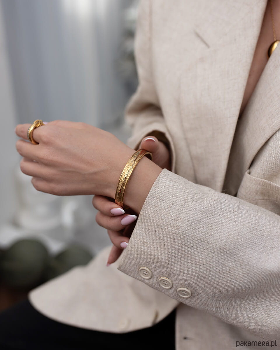 Jej delikatnie młotkowana powierzchnia subtelnie odbija światło, tworząc piękny, lekko surowy efekt, który przyciąga spojrzenia. To nie tylko modny dodatek, ale także wyraz Twojej siły i stylu niezależnie od okazji.Pozostaje komfortowa nawet podczas całodziennego noszenia. Nie dominuje stylizacji i idealnie sprawdzi się zarówno do biura, jak i na wieczorne wyjście. Mimo swojej solidnej formy, bransoletka waży zaledwie 44 g, co czyni ją idealnym wyborem dla kobiet, które cenią wygodę bez rezygnacji z efektownego wyglądu.Wykonana ze stali chirurgicznej premium, jest odporna na działanie wody, nie ciemnieje i nie traci swojego blasku nawet po wielu sezonach. Wymiary:Średnica wewnętrzna: 6,3 cmSzerokość: 1 cm