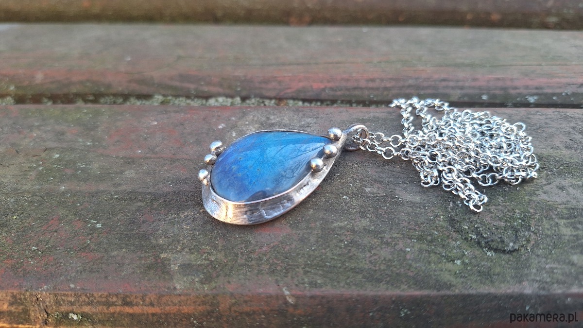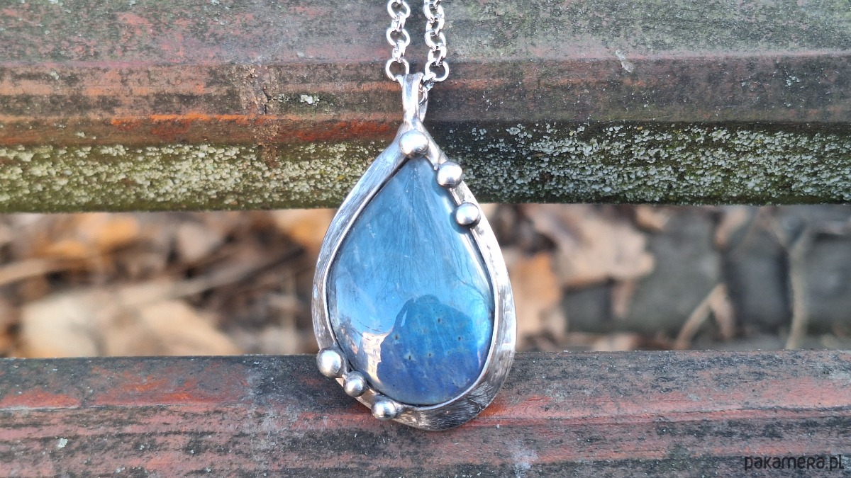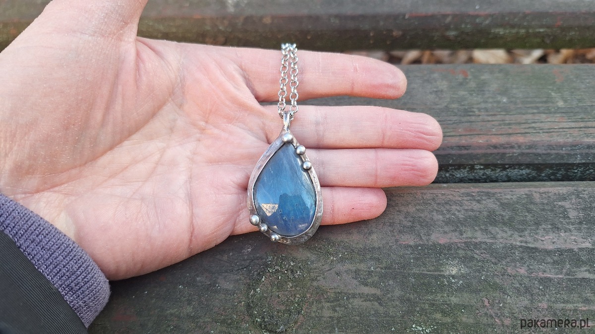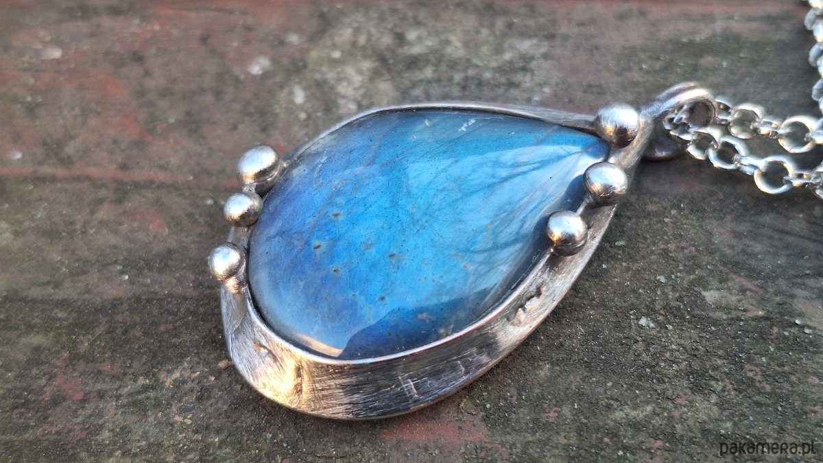 Wisiorek wykonany z miedzi, cyny i labradorytu. Wymiary ok. 4 na 2.7 cm. Zawieszony na łańcuszku o długości ok. 50 cm.