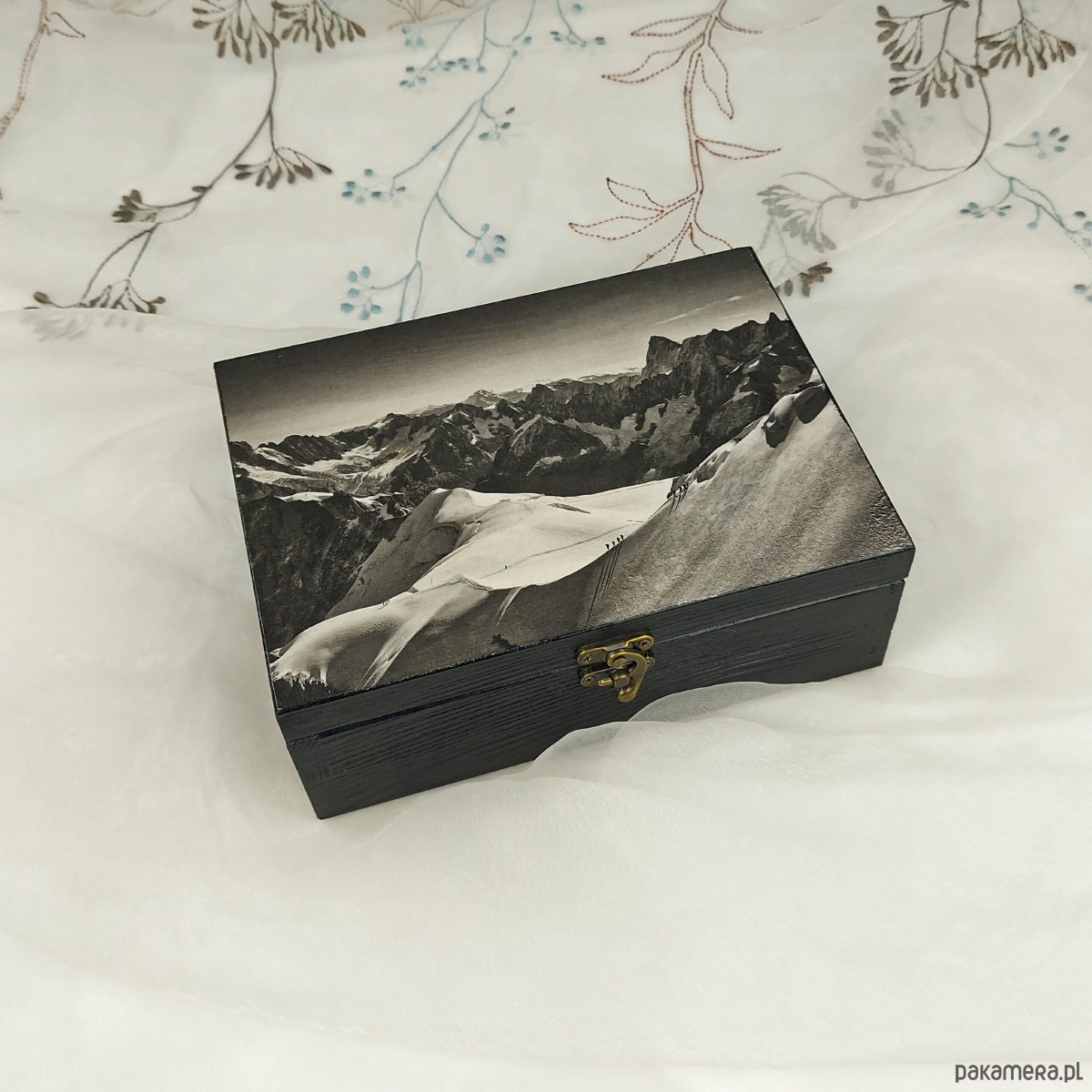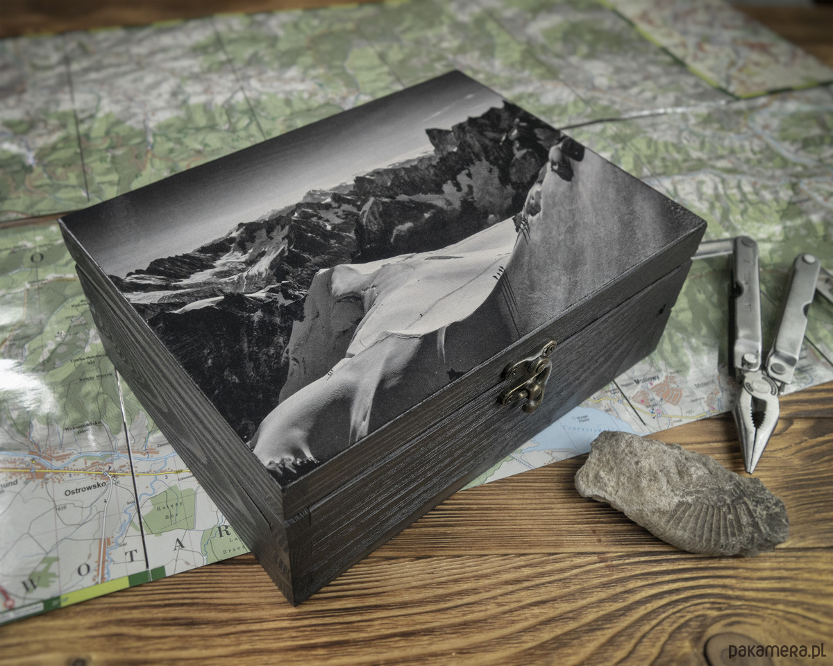 Drewnianą szkatułkę ręcznie ozdobiliśmy transferem własnej fotografii (autor – Jan Świerkot). Rozległy widok roztaczający się z Aiguille du Midi na francuskie Alpy przypadnie do gustu każdemu miłośnikowi górskich klimatów.