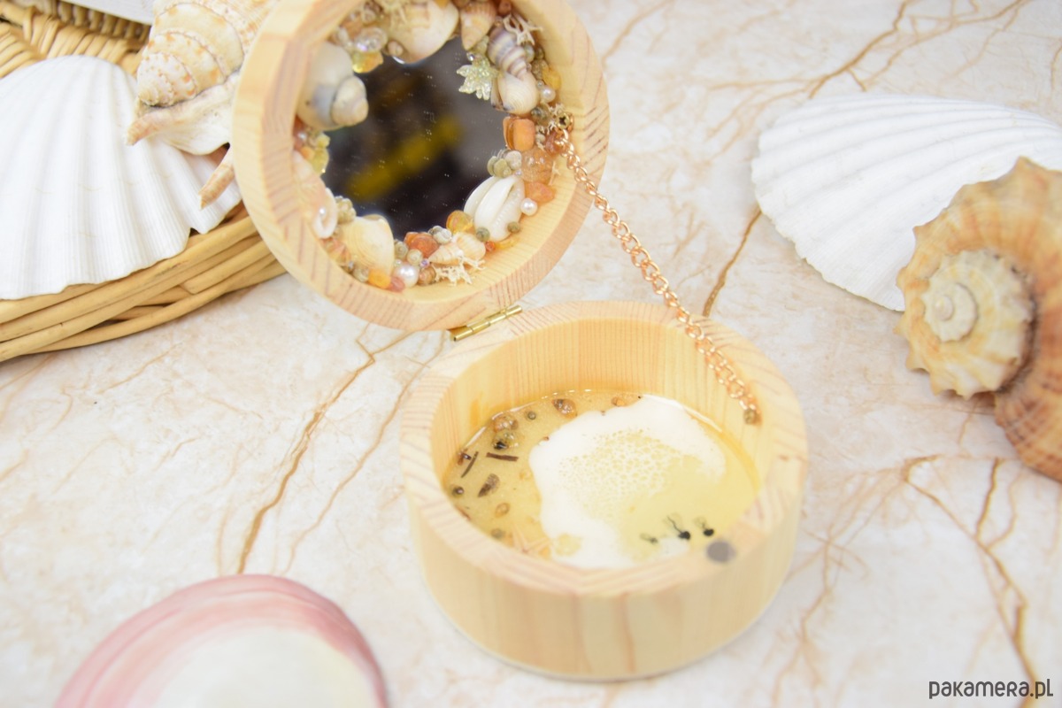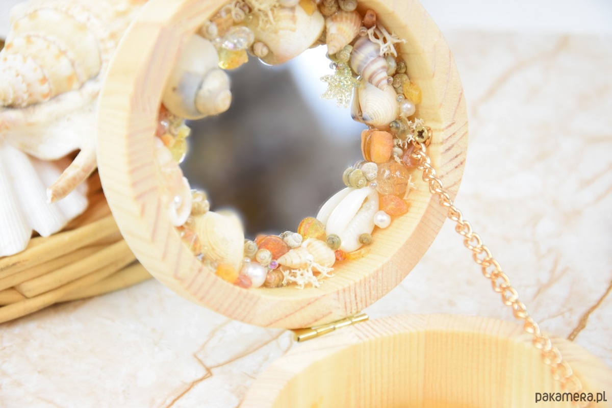Wewnątrz znajdziesz lusterko otulone wieńcem z morskich skarbów: polskich bursztynów, muszli, pereł, błyszczących diamentów oraz rozgwiazd – jakby zatrzymanych w czasie wspomnień z wakacji nad Bałtykiem.