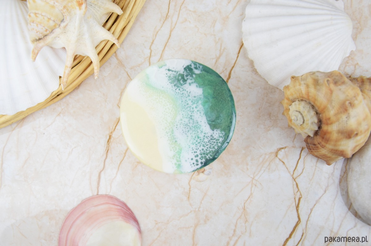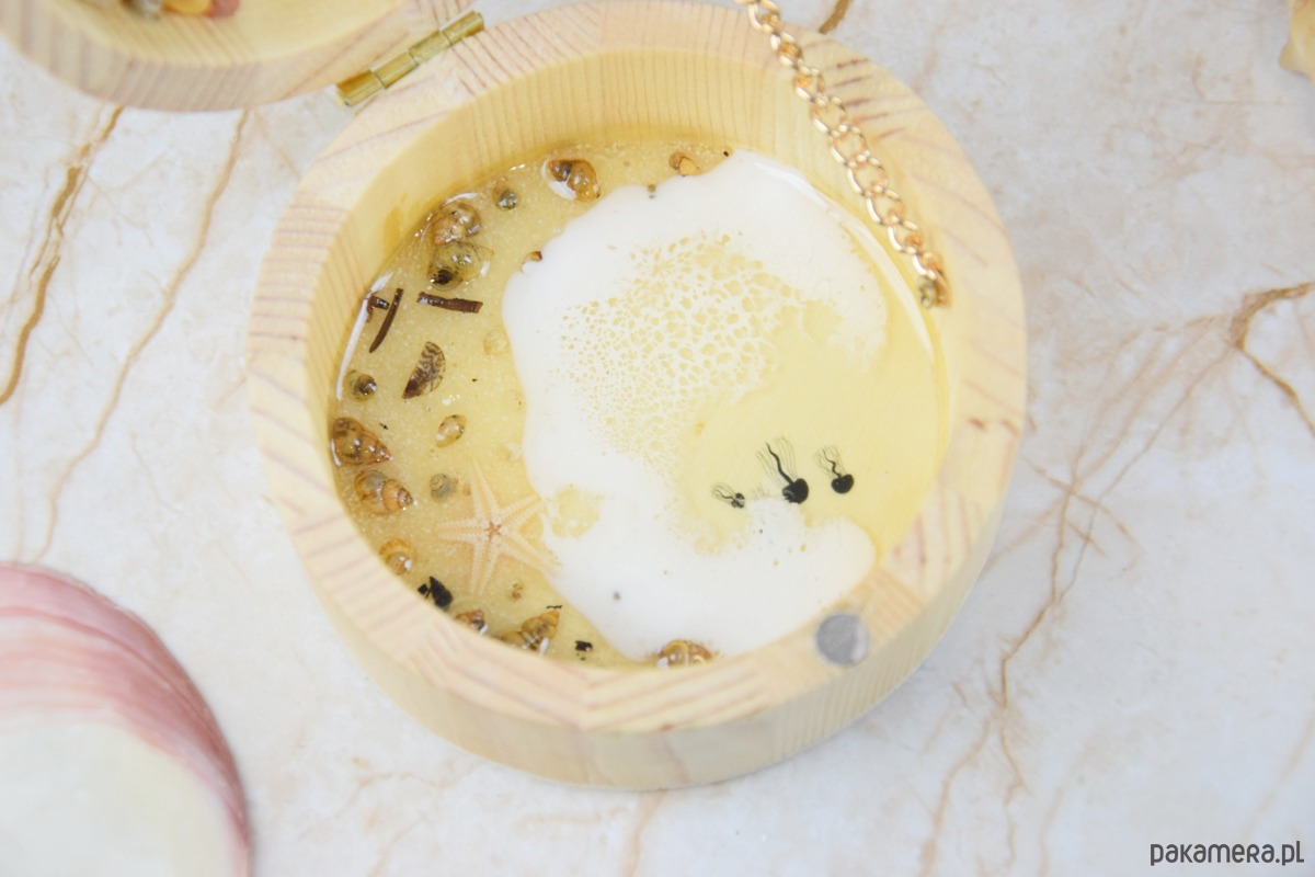 Wieczko i wnętrze zdobi wyjątkowy motyw morski wylany z żywicy – głęboki, niepowtarzalny wzór, który przywodzi na myśl fale, piasek i bezkres oceanu. Szkatułka otwierana jest za pomocą subtelnie osadzonej muszli, która pełni funkcję uchwytu – naturalny, delikatny detal, idealnie wpisujący się w morski klimat.