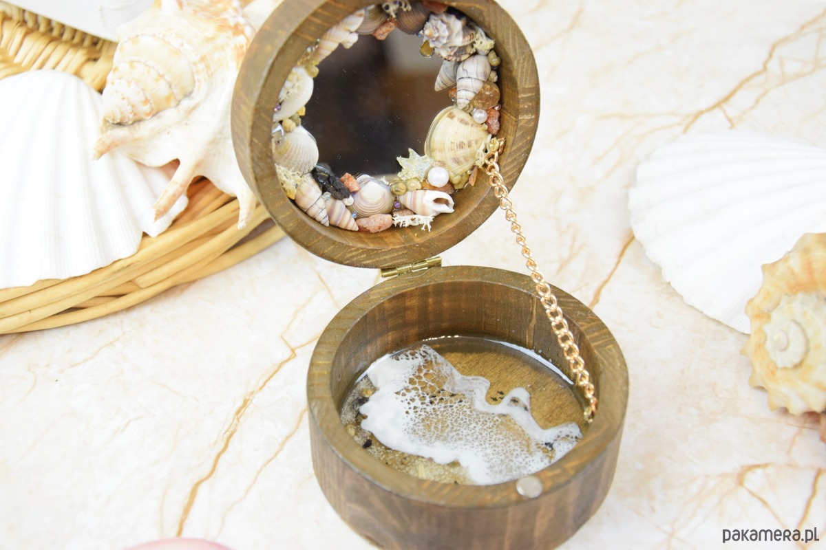 Wieczko i wnętrze zdobi wyjątkowy motyw morski wylany z żywicy – głęboki, niepowtarzalny wzór, który przywodzi na myśl fale, piasek i bezkres oceanu. Szkatułka otwierana jest za pomocą subtelnie osadzonej muszli, która pełni funkcję uchwytu – naturalny, delikatny detal, idealnie wpisujący się w morski klimat.