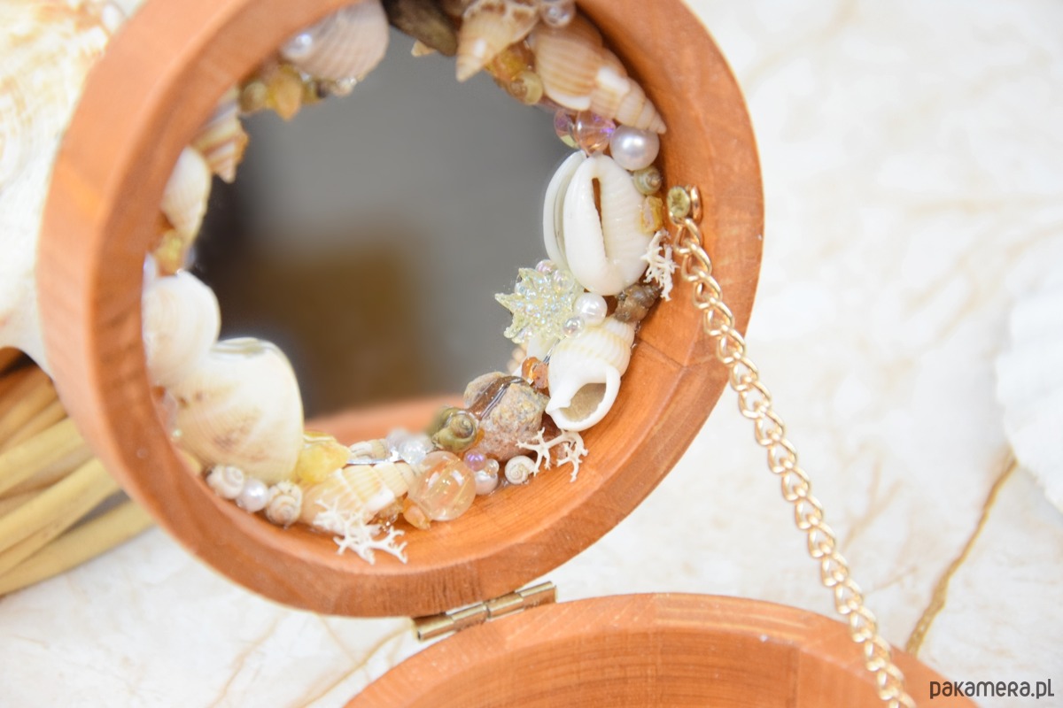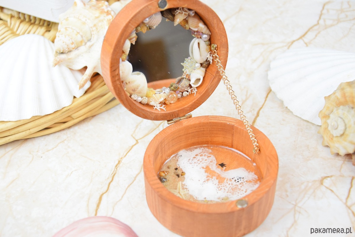 Wewnątrz znajdziesz lusterko otulone wieńcem z morskich skarbów: polskich bursztynów, muszli, pereł, błyszczących diamentów oraz rozgwiazd – jakby zatrzymanych w czasie wspomnień z wakacji nad Bałtykiem.