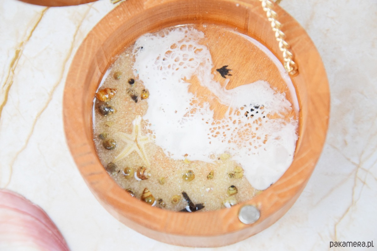Wieczko i wnętrze zdobi wyjątkowy motyw morski wylany z żywicy – głęboki, niepowtarzalny wzór, który przywodzi na myśl fale, piasek i bezkres oceanu. Szkatułka otwierana jest za pomocą subtelnie osadzonej muszli, która pełni funkcję uchwytu – naturalny, delikatny detal, idealnie wpisujący się w morski klimat.