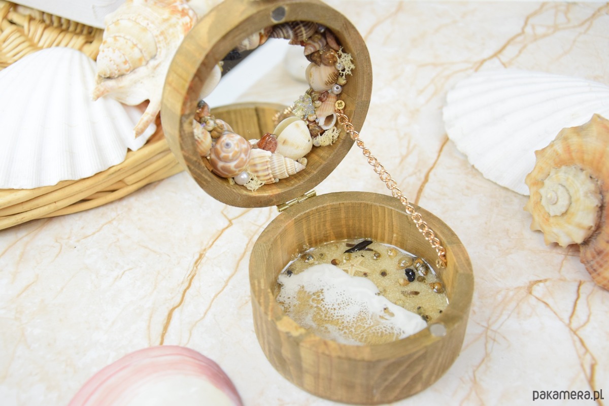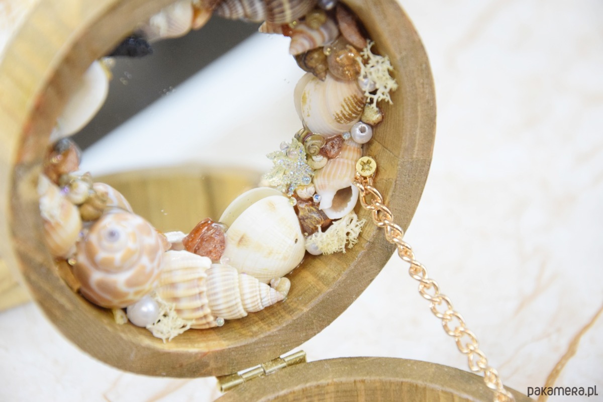 Wewnątrz znajdziesz lusterko otulone wieńcem z morskich skarbów: polskich bursztynów, muszli, pereł, błyszczących diamentów oraz rozgwiazd – jakby zatrzymanych w czasie wspomnień z wakacji nad Bałtykiem.