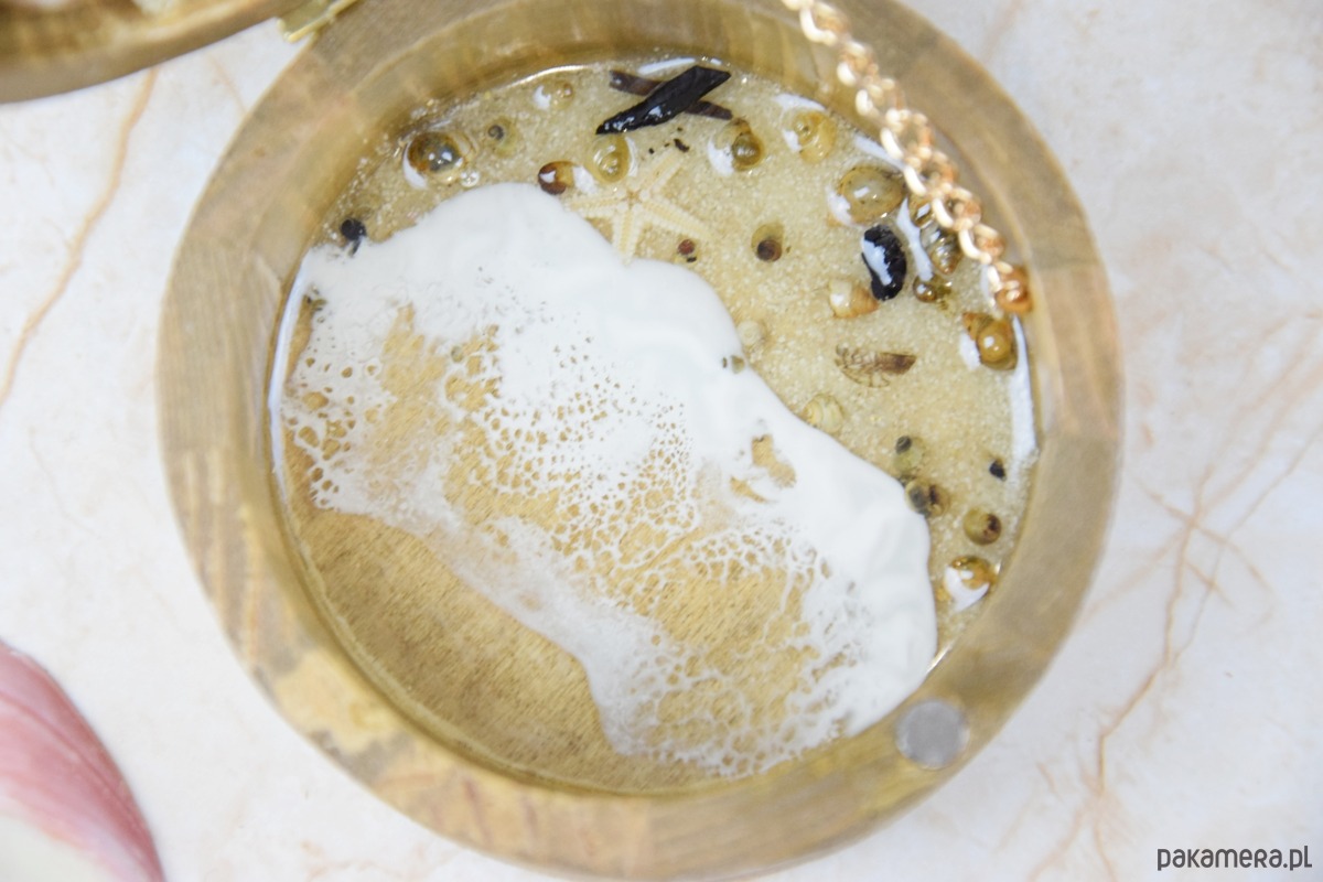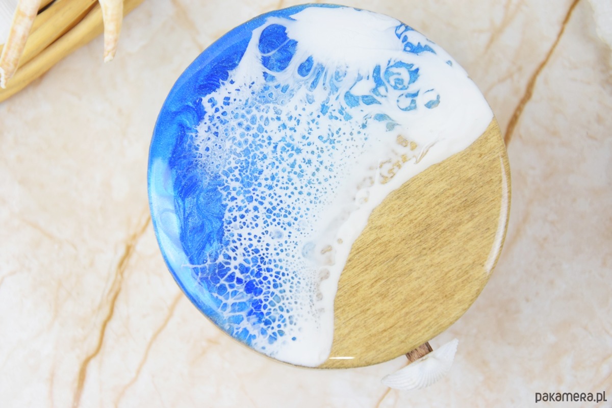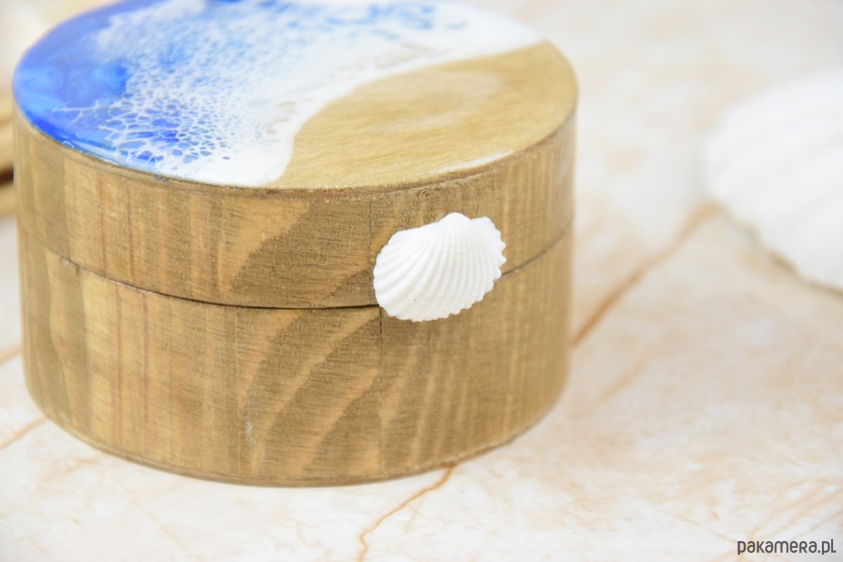Wieczko i wnętrze zdobi wyjątkowy motyw morski wylany z żywicy – głęboki, niepowtarzalny wzór, który przywodzi na myśl fale, piasek i bezkres oceanu. Szkatułka otwierana jest za pomocą subtelnie osadzonej muszli, która pełni funkcję uchwytu – naturalny, delikatny detal, idealnie wpisujący się w morski klimat.