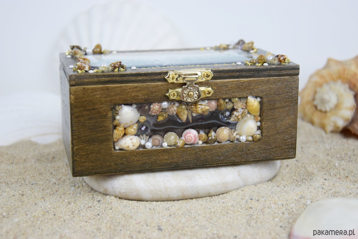 Z przodu szkatułki umieszczono dekoracyjne okienko, w którym znajduje się starannie ułożona kompozycja z muszli, bursztynów, pereł oraz elementów ozdobnych. Dla trwałości i ochrony wszystkie muszle zostały pokryte warstwą żywicy, dzięki czemu są zabezpieczone przed uszkodzeniami.