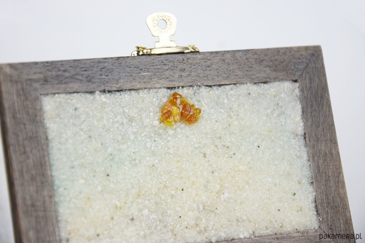 Na spodzie pokrywy znajduje się drobny piasek, na którym ułożone zostało serce stworzone z prawdziwych polskich bursztynów – subtelny i symboliczny akcent dodający całości wyjątkowego uroku. Szkatułka została osadzona na korkowych stopkach, które chronią powierzchnię mebli i zapewniają stabilność.