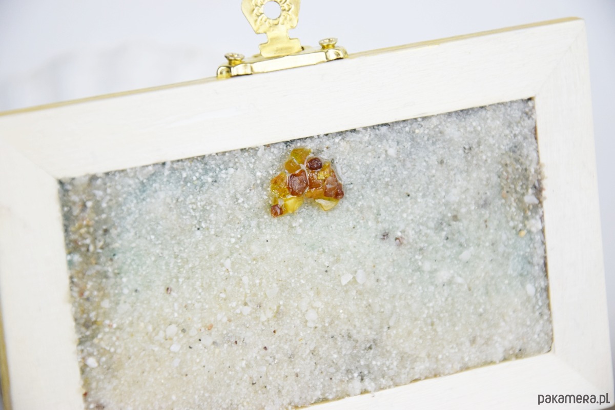 Na spodzie pokrywy znajduje się drobny piasek, na którym ułożone zostało serce stworzone z prawdziwych polskich bursztynów – subtelny i symboliczny akcent dodający całości wyjątkowego uroku. Szkatułka została osadzona na korkowych stopkach, które chronią powierzchnię mebli i zapewniają stabilność.