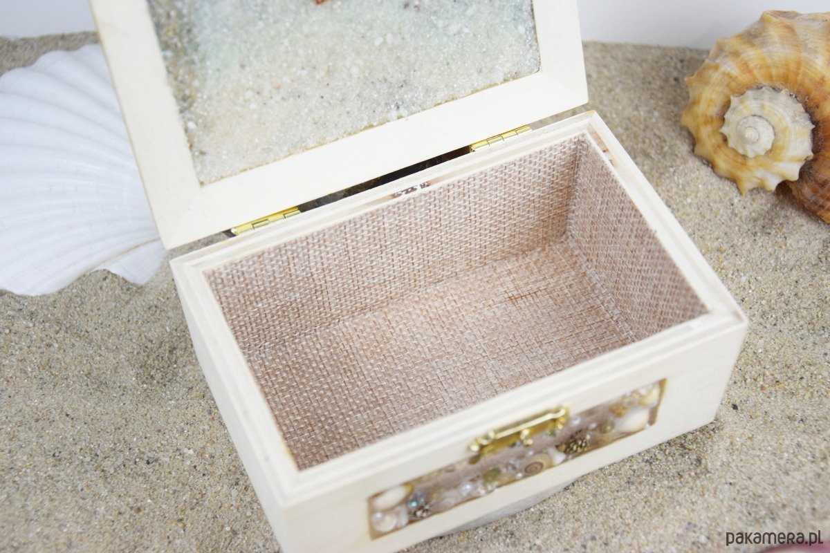 Wnętrze szkatułki wyłożono tkaniną przypominającą jutę, która pięknie komponuje się z naturalnym, morskim charakterem dekoracji.