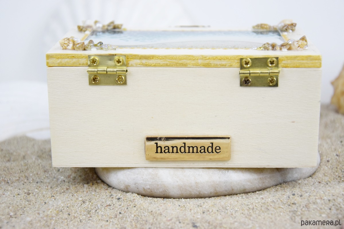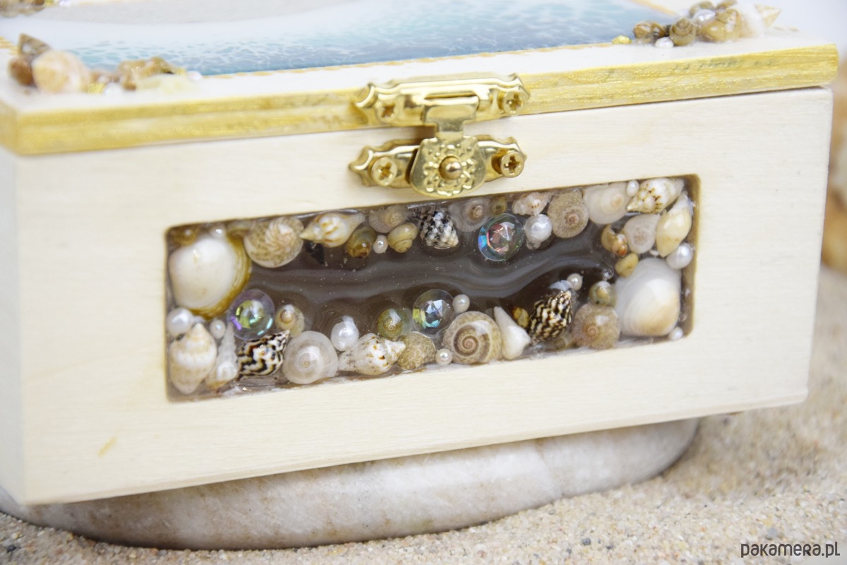 Z przodu szkatułki umieszczono dekoracyjne okienko, w którym znajduje się starannie ułożona kompozycja z muszli, bursztynów, pereł oraz elementów ozdobnych. Dla trwałości i ochrony wszystkie muszle zostały pokryte warstwą żywicy, dzięki czemu są zabezpieczone przed uszkodzeniami.