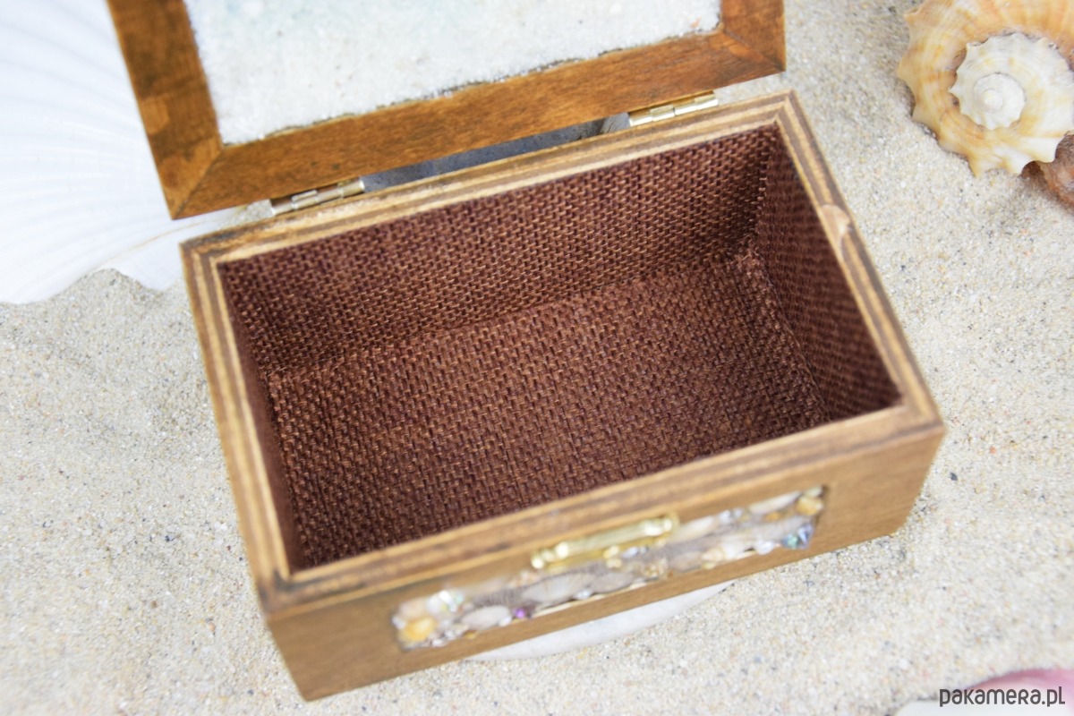 Wnętrze szkatułki wyłożono tkaniną przypominającą jutę, która pięknie komponuje się z naturalnym, morskim charakterem dekoracji.