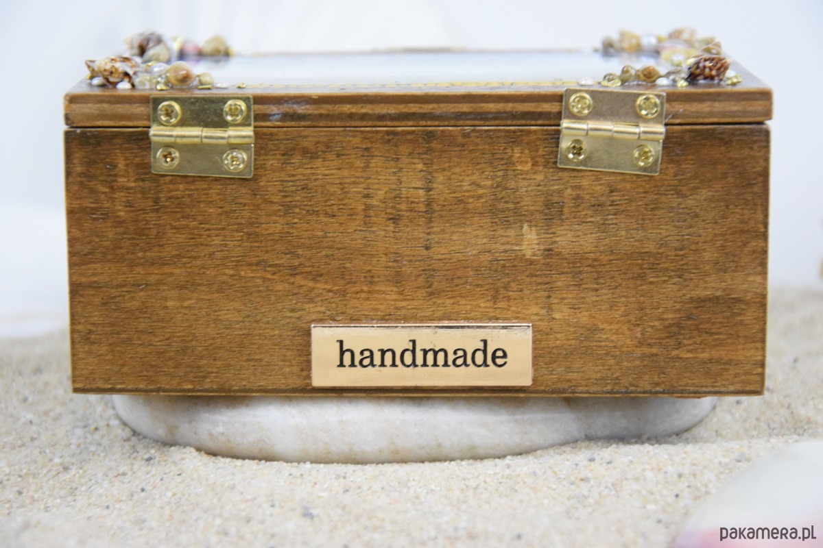 Z przodu szkatułki umieszczono dekoracyjne okienko, w którym znajduje się starannie ułożona kompozycja z muszli, bursztynów, pereł oraz elementów ozdobnych. Dla trwałości i ochrony wszystkie muszle zostały pokryte warstwą żywicy, dzięki czemu są zabezpieczone przed uszkodzeniami.