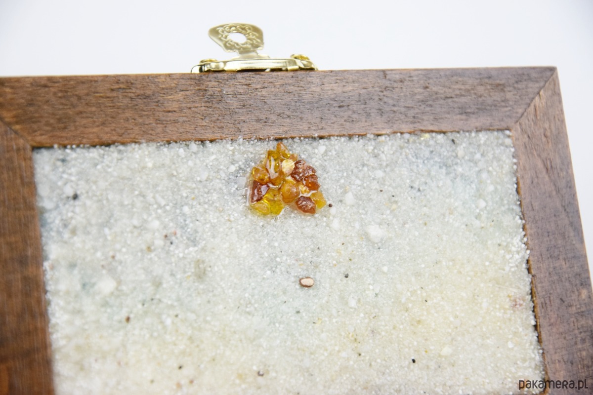 Na spodzie pokrywy znajduje się drobny piasek, na którym ułożone zostało serce stworzone z prawdziwych polskich bursztynów – subtelny i symboliczny akcent dodający całości wyjątkowego uroku. Szkatułka została osadzona na korkowych stopkach, które chronią powierzchnię mebli i zapewniają stabilność.