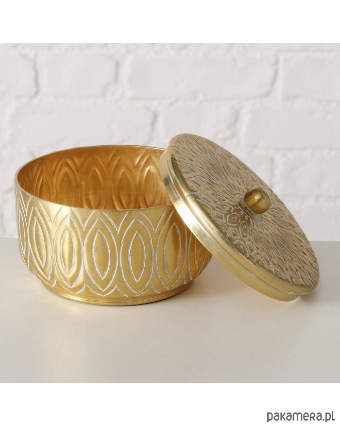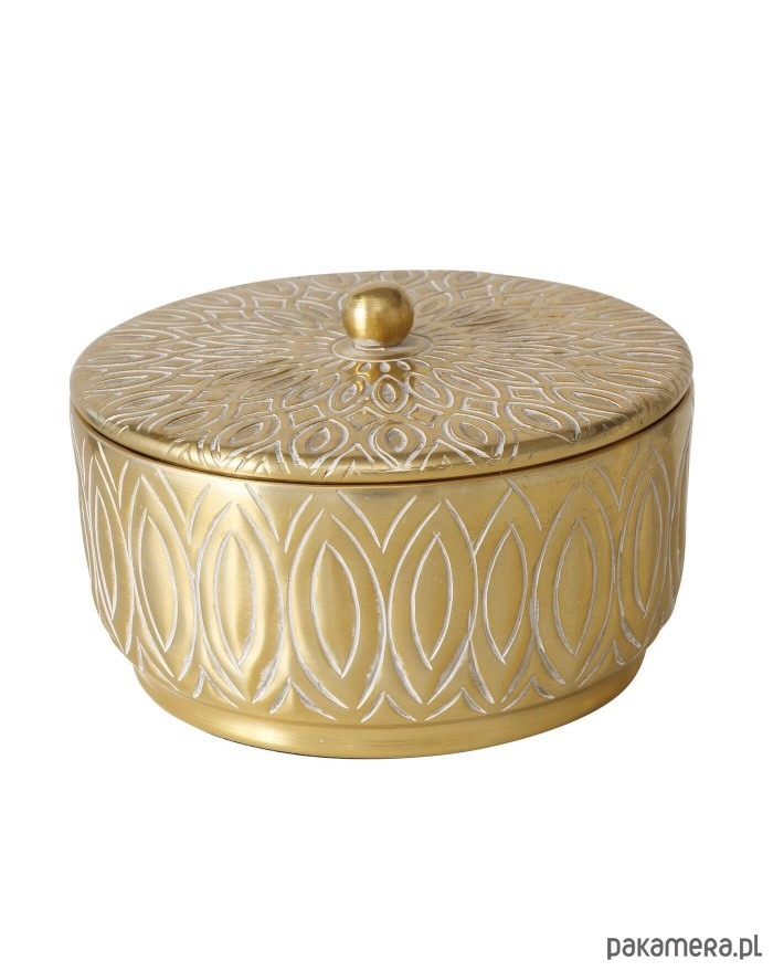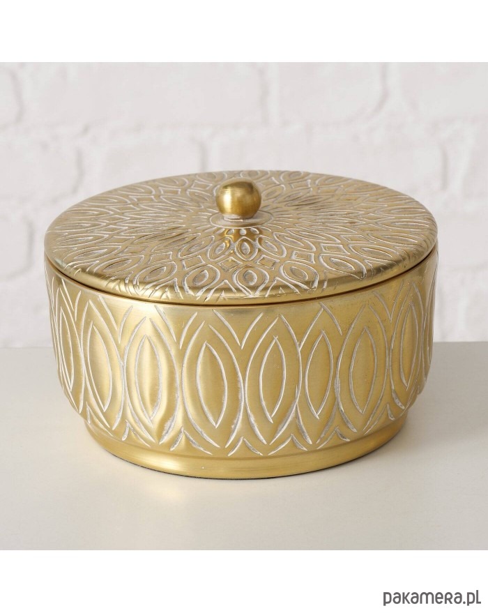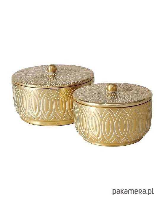 Komplet dwóch okrągłych szkatułek wykonanych z metalu. W kolorze złotym z jasnym, orientalnym ornamentem. Idealne na biżuterię a także jako prezent.