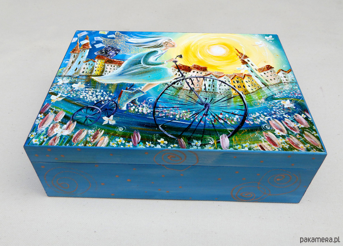 Podłużna, drewniana szkatułka, wykonana techniką decoupage. Na jej wierzchniej części umieszczona została reprodukcja obrazu autorskiego, zatytułowanego "Poranek na dobre wiadomości", natomiast boki szkatułki zdobione są ręcznie przy użyciu farby akrylowej. Całość zabezpieczona jest bezbarwnym lakierem z połyskiem oraz sygnowana w środku.
