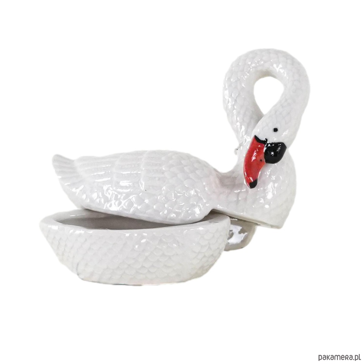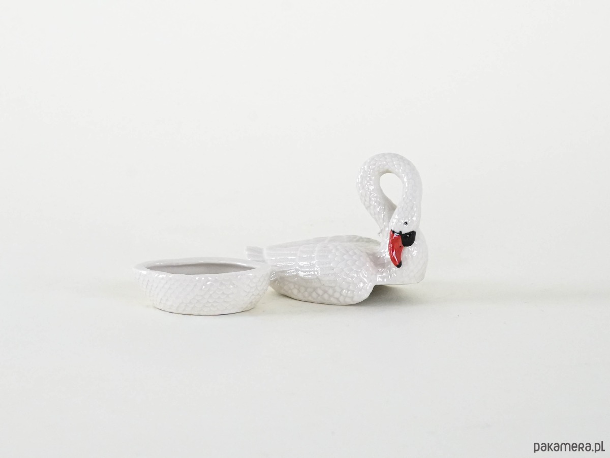 Mały, otwierany pojemniczek w formie białego łabędzia z ręcznie malowanymi detalami. Idealny na drobiazgi – np. pierścionek czy tabletkę. Porcelana szkliwiona, lekko fakturowana.