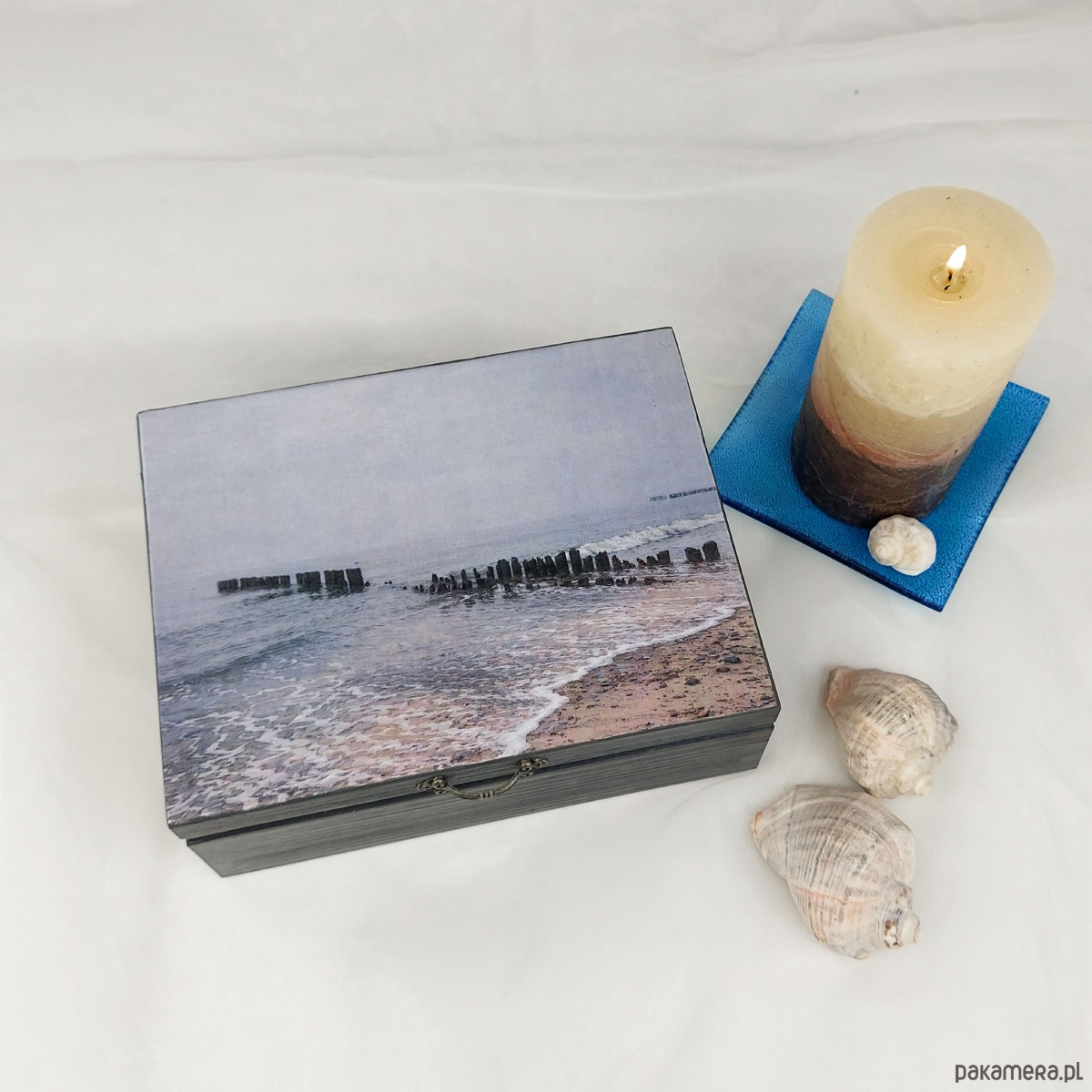Drewnianą szkatułkę ręcznie ozdobiliśmy nanosząc na wieczko własną fotografię. Łagodna szarość morza wprowadzi nieco spokoju w każde wnętrze. Boki pudełka są nieco ciemniejsze niż wnętrze, kolory współgrają z klimatem fotografii. Końcowy etap to zabezpieczenie całości lakierem akrylowym (wodnym).