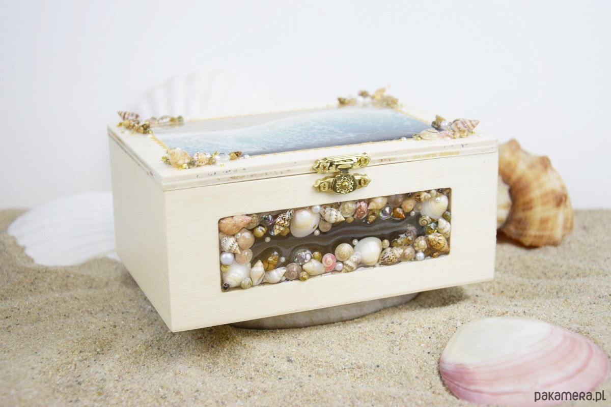 Z przodu szkatułki umieszczono dekoracyjne okienko, w którym znajduje się starannie ułożona kompozycja z muszli, bursztynów, pereł oraz elementów ozdobnych. Dla trwałości i ochrony wszystkie muszle zostały pokryte warstwą żywicy, dzięki czemu są zabezpieczone przed uszkodzeniami.