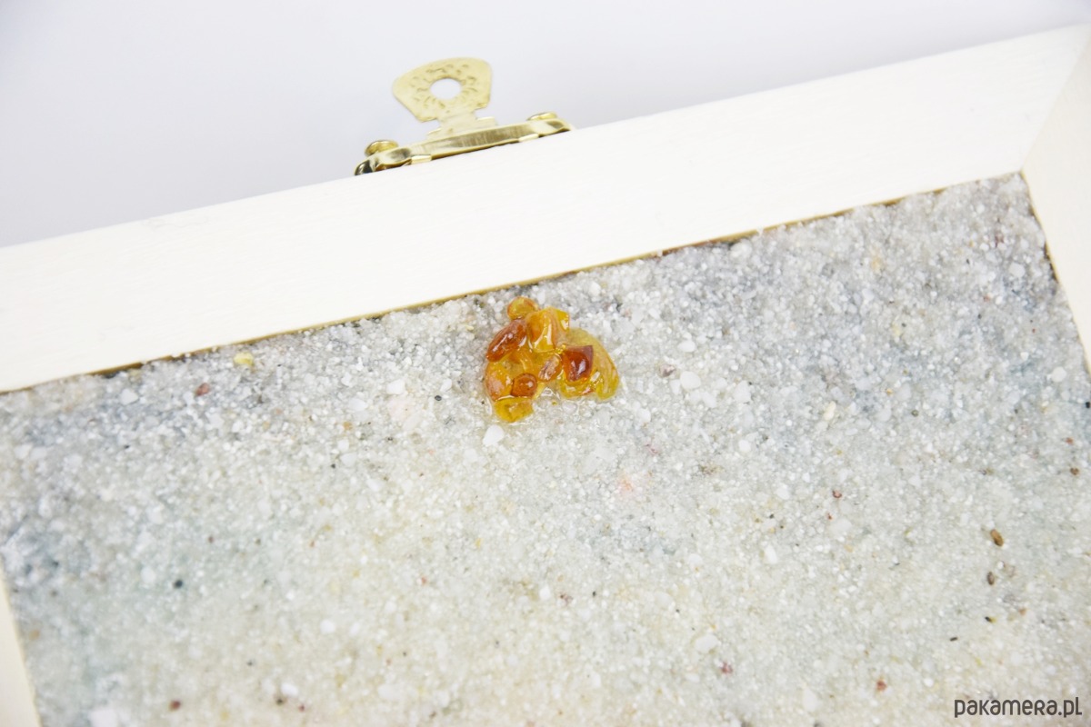 Na spodzie pokrywy znajduje się drobny piasek, na którym ułożone zostało serce stworzone z prawdziwych polskich bursztynów – subtelny i symboliczny akcent dodający całości wyjątkowego uroku. Szkatułka została osadzona na korkowych stopkach, które chronią powierzchnię mebli i zapewniają stabilność.