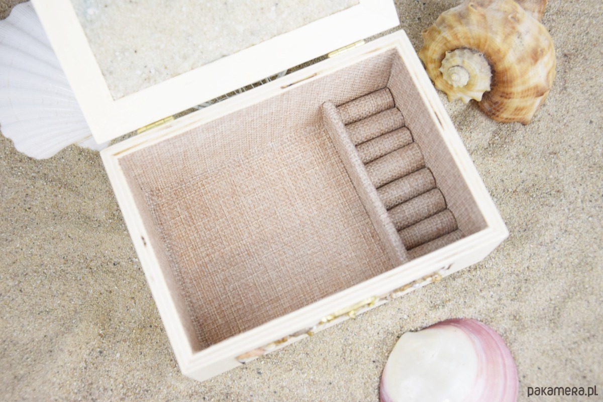 Wnętrze szkatułki wyłożono tkaniną przypominającą jutę, która pięknie komponuje się z naturalnym, morskim charakterem dekoracji. W środku znajduje się również praktyczna przegródka na pierścionki, która pozwala wygodnie i bezpiecznie przechowywać drobną biżuterię.