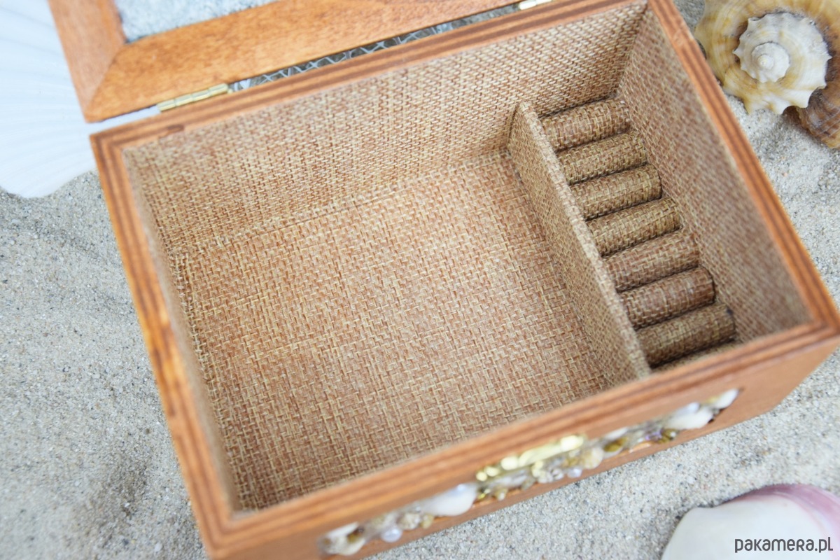 Wnętrze szkatułki wyłożono tkaniną przypominającą jutę, która pięknie komponuje się z naturalnym, morskim charakterem dekoracji. W środku znajduje się również praktyczna przegródka na pierścionki, która pozwala wygodnie i bezpiecznie przechowywać drobną biżuterię.