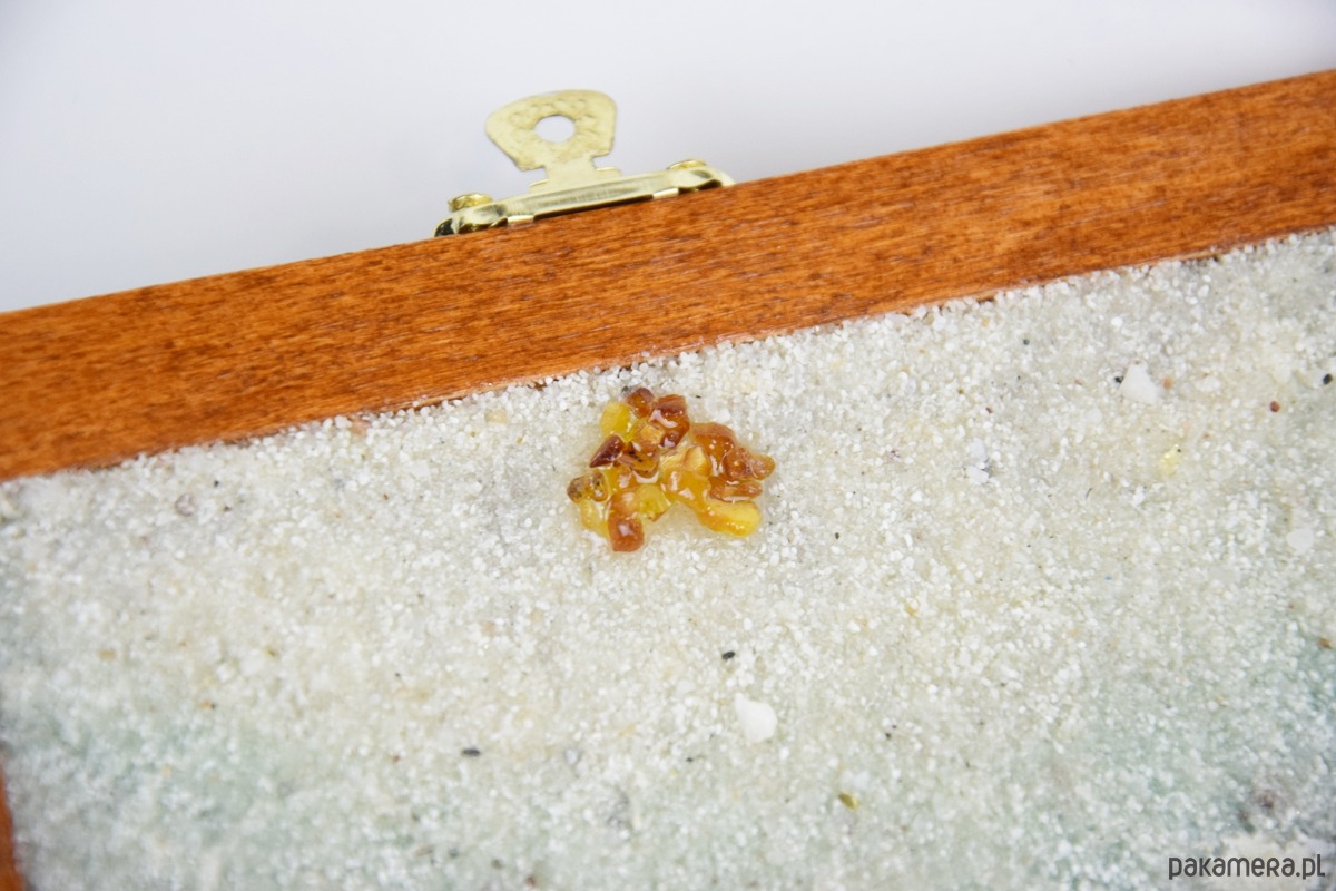 Na spodzie pokrywy znajduje się drobny piasek, na którym ułożone zostało serce stworzone z prawdziwych polskich bursztynów – subtelny i symboliczny akcent dodający całości wyjątkowego uroku. Szkatułka została osadzona na korkowych stopkach, które chronią powierzchnię mebli i zapewniają stabilność.