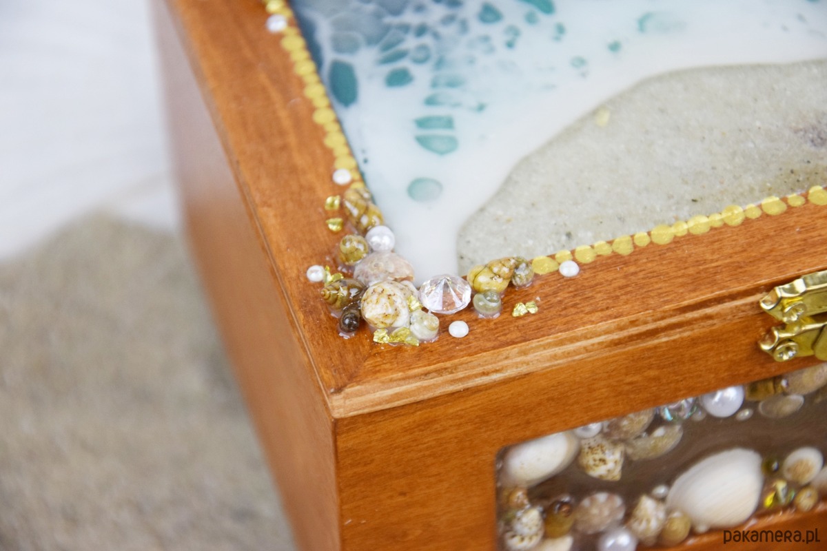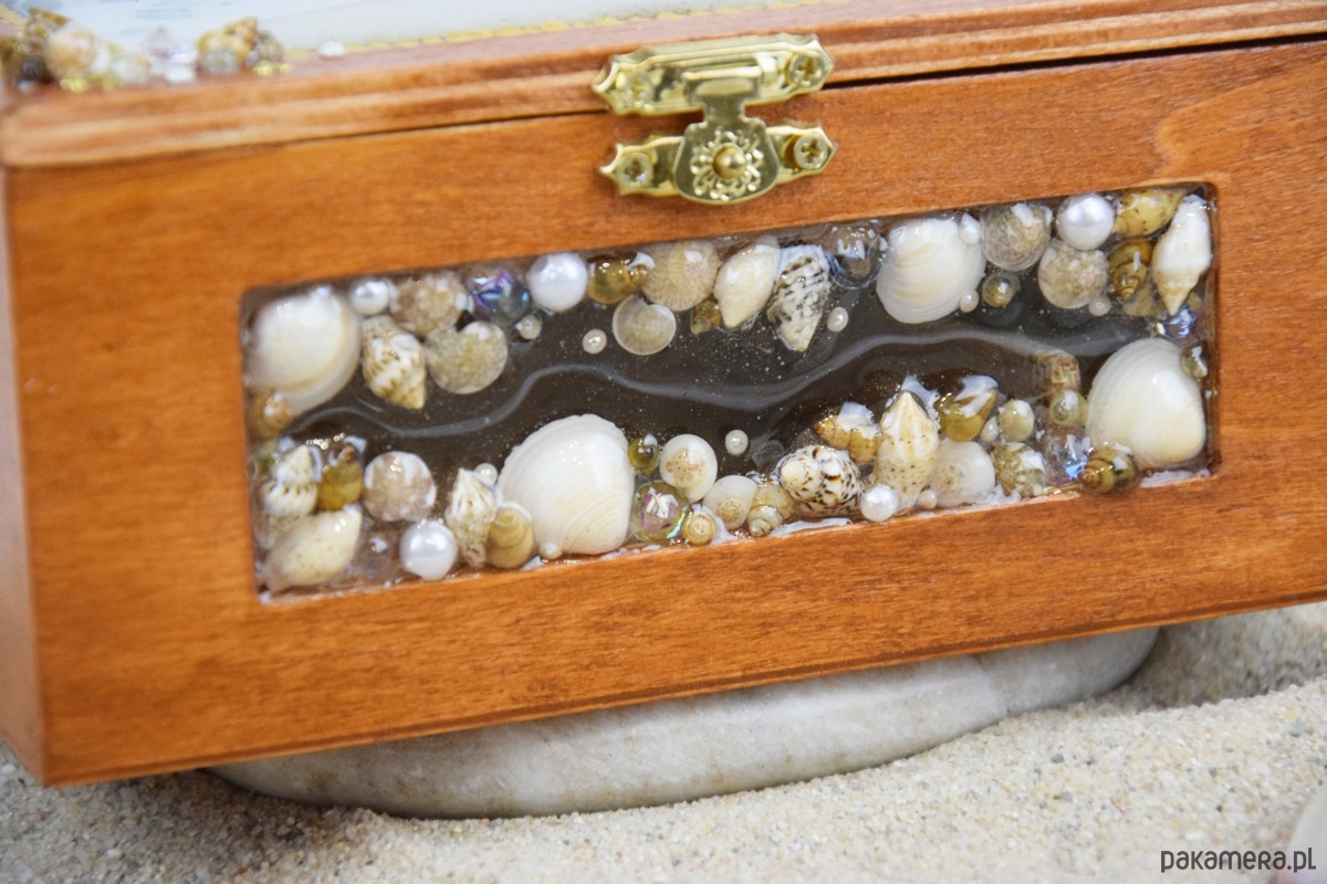 Z przodu szkatułki umieszczono dekoracyjne okienko, w którym znajduje się starannie ułożona kompozycja z muszli, bursztynów, pereł oraz elementów ozdobnych. Dla trwałości i ochrony wszystkie muszle zostały pokryte warstwą żywicy, dzięki czemu są zabezpieczone przed uszkodzeniami.