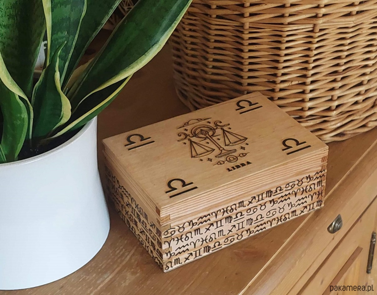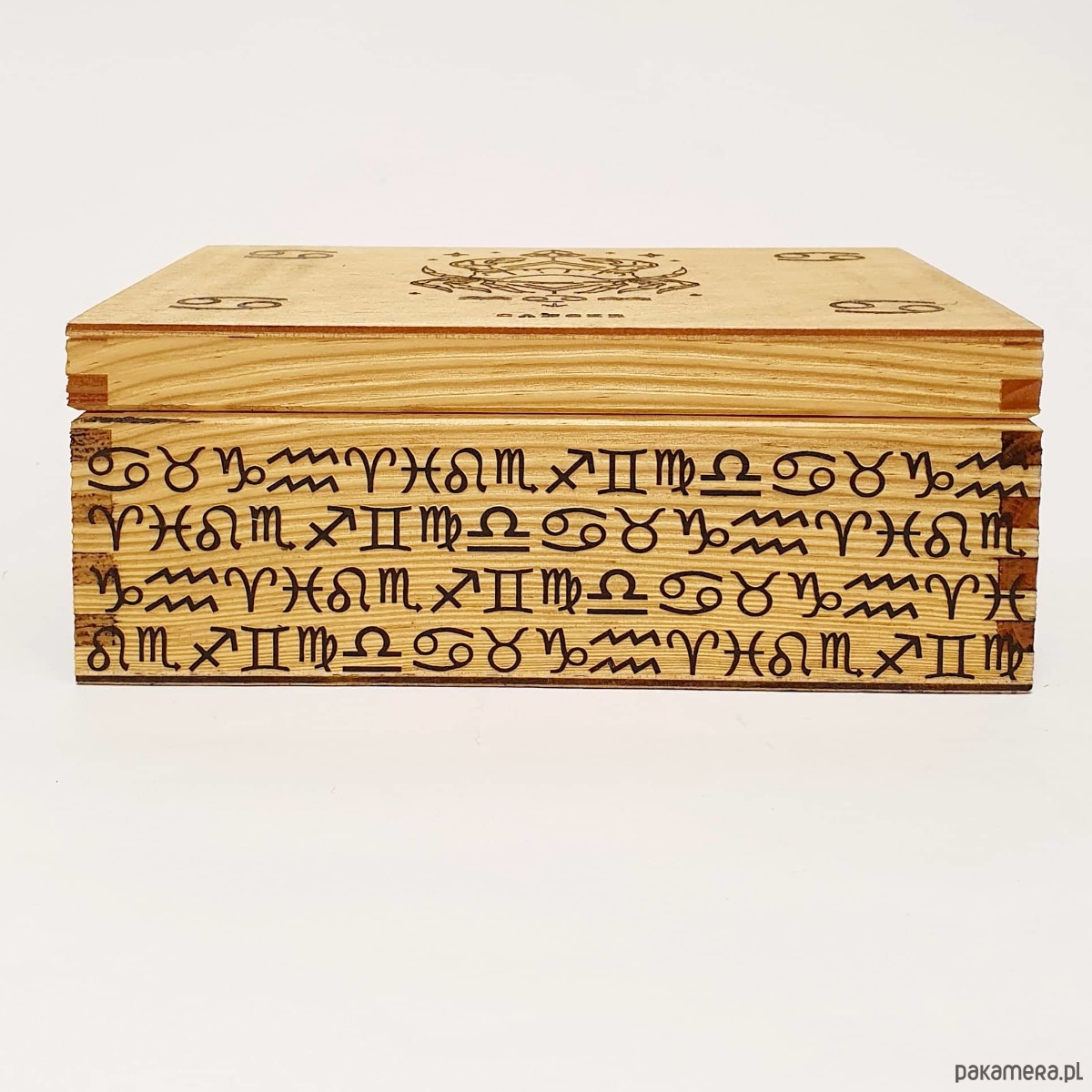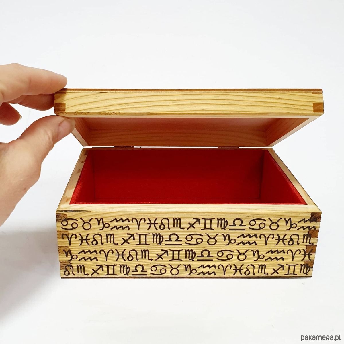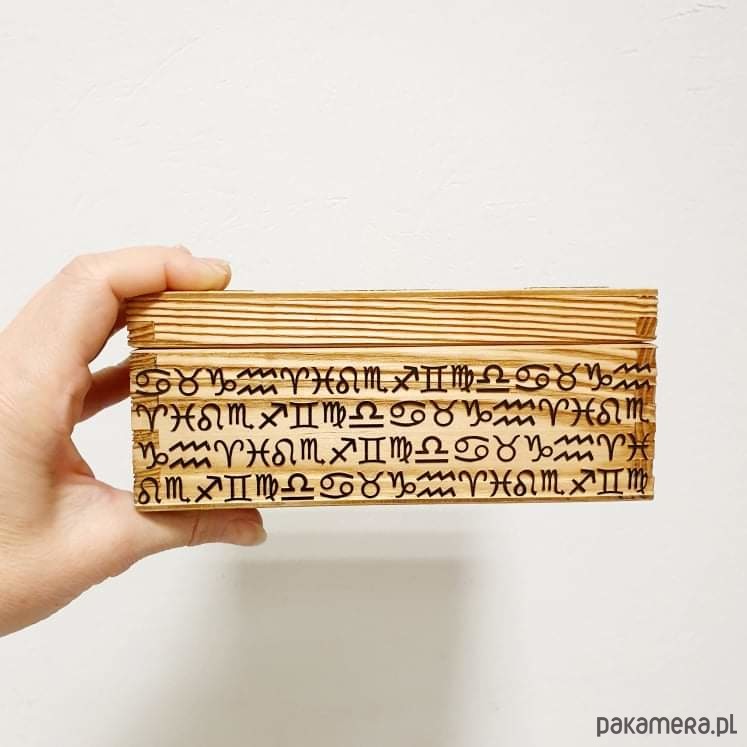Ręcznie wykonywane, drewniane szkatułki ze znakami Zodiaku. Szkatułki te są misternie zdobione zarówno od góry, ale i po bokach. Wieczko szkatułki udekorowane jest wybranym znakiem Zodiaku a po bokach znajdują się symbole wszystkich znaków Zodiaku. Niezwykle dekoracyjnym elementem szkatułki jest jej wnętrze wyściełane czerwonym filcem. Dzięki temu biżuteria nie rysuje się, jest zabezpieczona i prezentuje się niezmiernie ekskluzywnie.