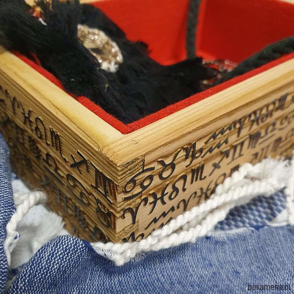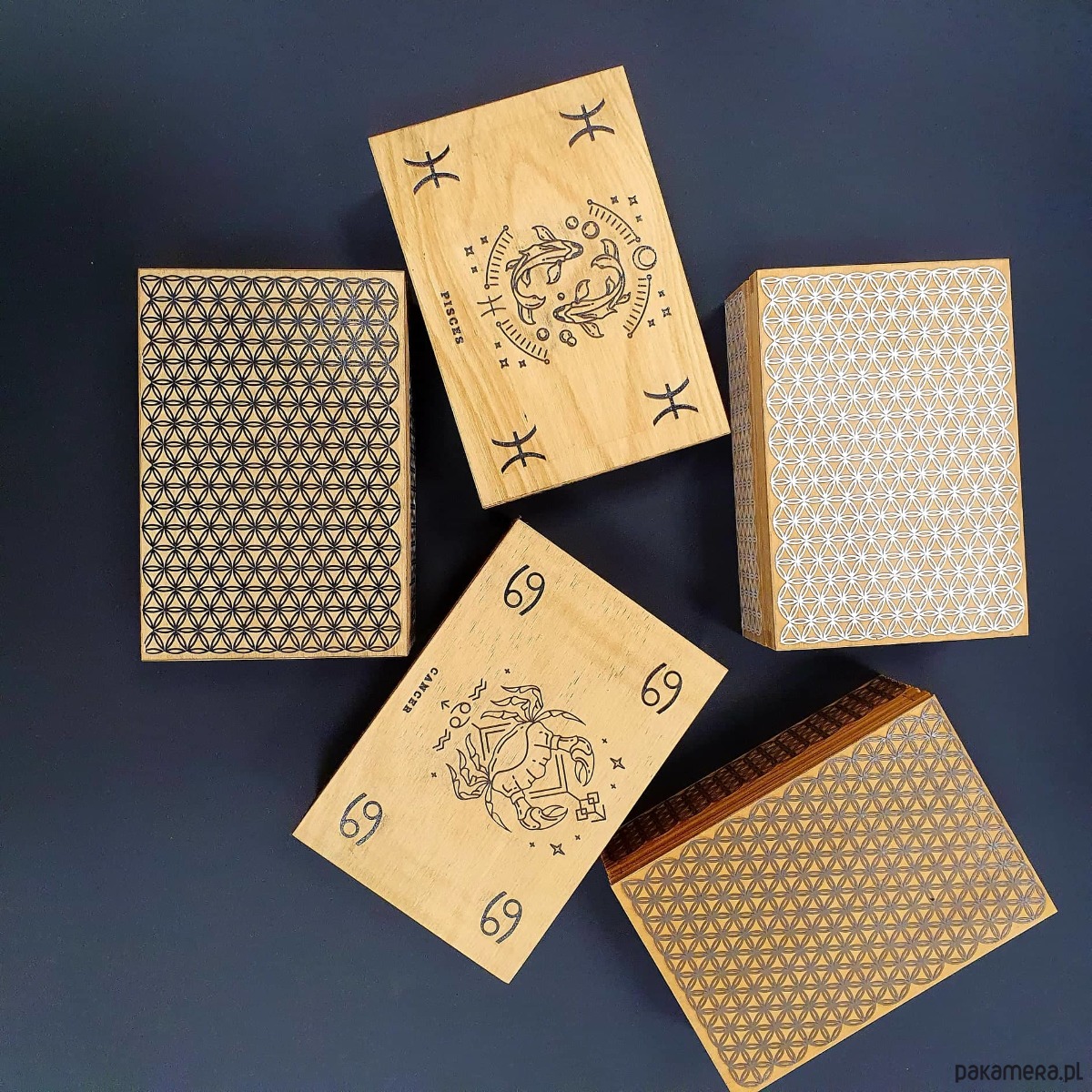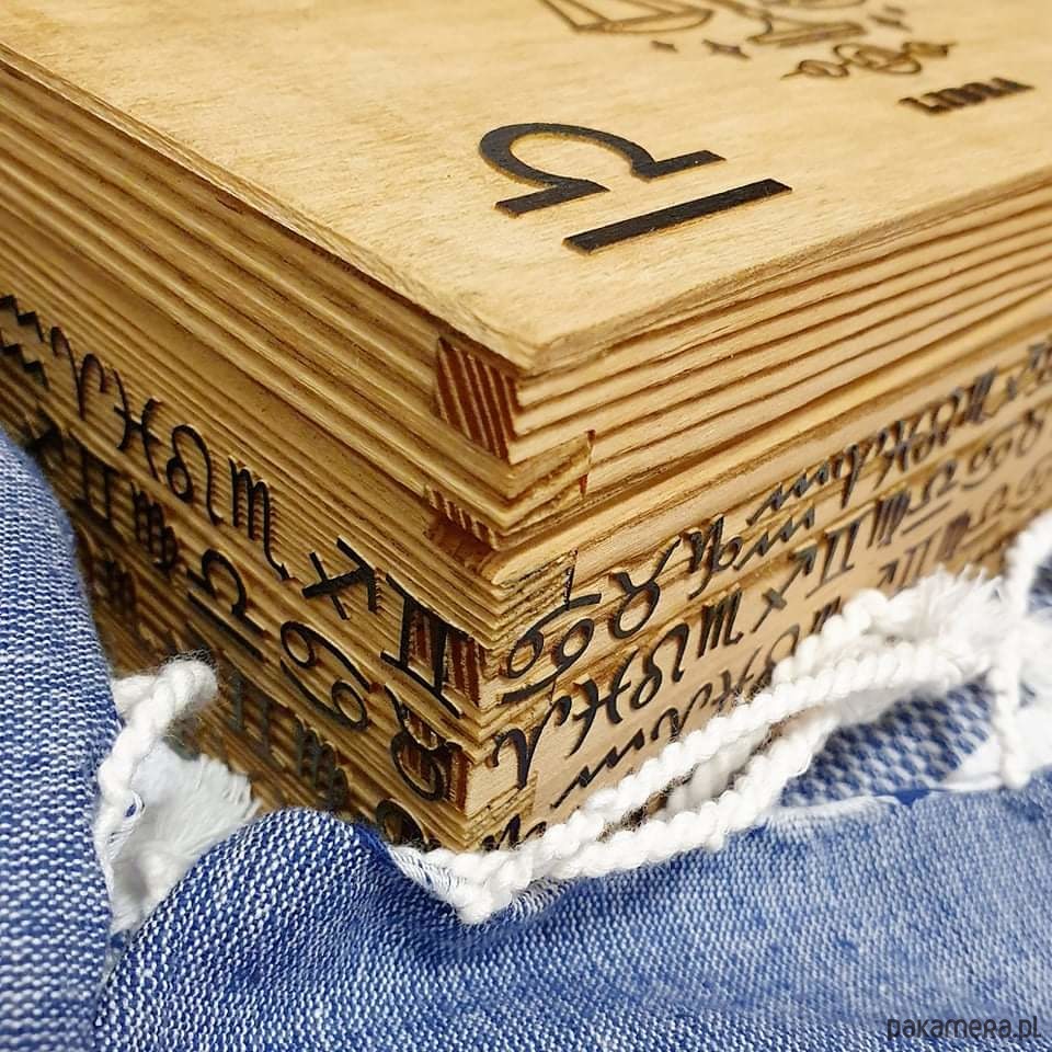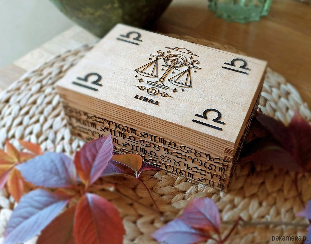Ręcznie wykonywane, drewniane szkatułki ze znakami Zodiaku. Szkatułki te są misternie zdobione zarówno od góry, ale i po bokach. Wieczko szkatułki udekorowane jest wybranym znakiem Zodiaku a po bokach znajdują się symbole wszystkich znaków Zodiaku. Niezwykle dekoracyjnym elementem szkatułki jest jej wnętrze wyściełane czerwonym filcem. Dzięki temu biżuteria nie rysuje się, jest zabezpieczona i prezentuje się niezmiernie ekskluzywnie.