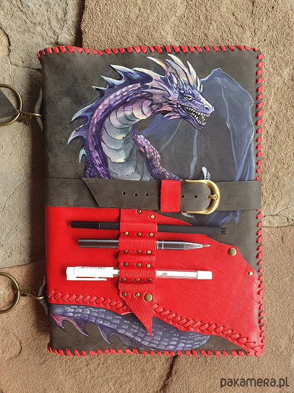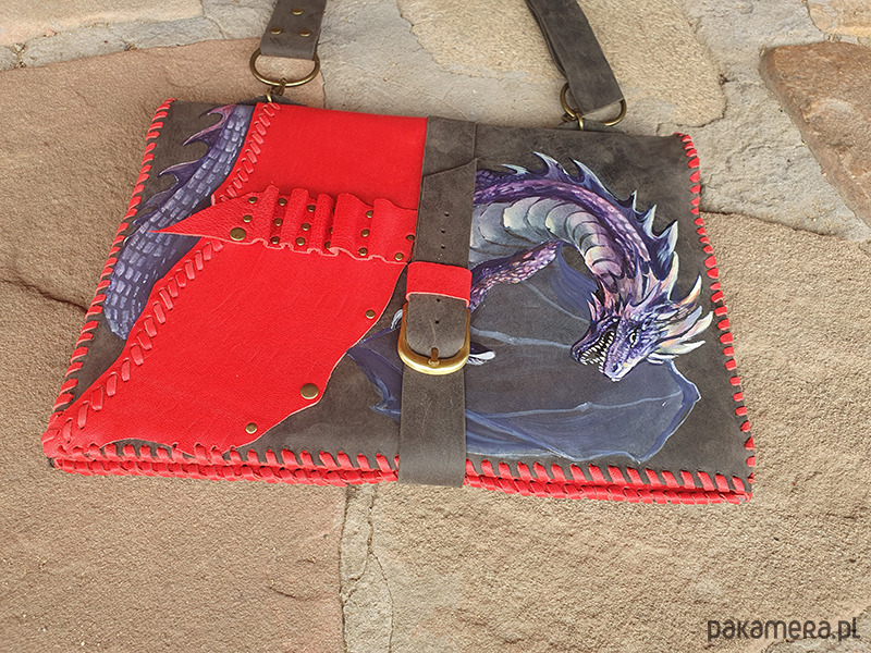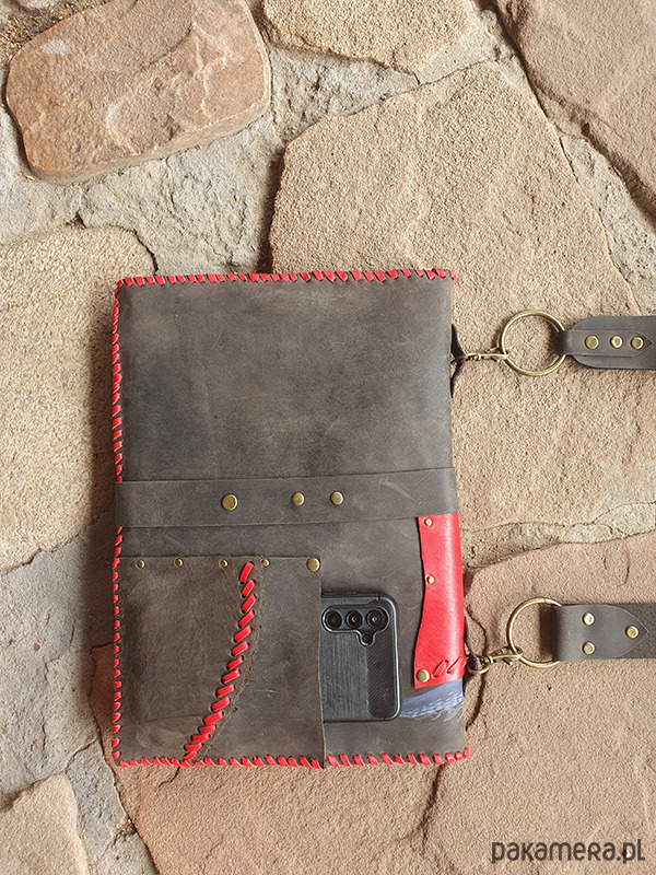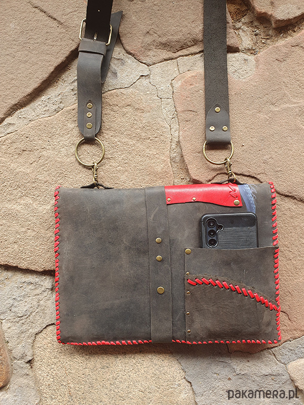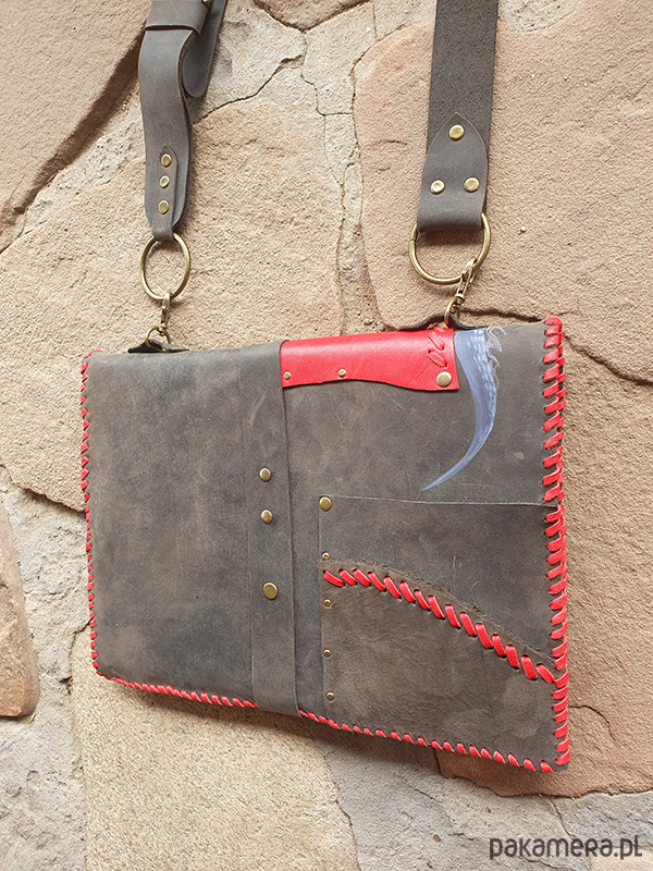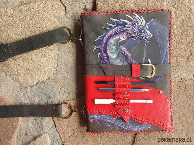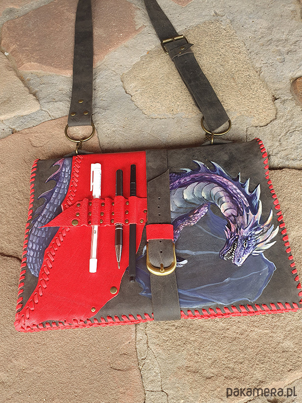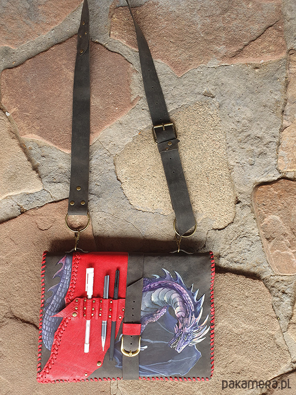 Szkicownik w skórzanej oprawie (zdejmowanej), można go nosić na ramieniu jak teczkę,