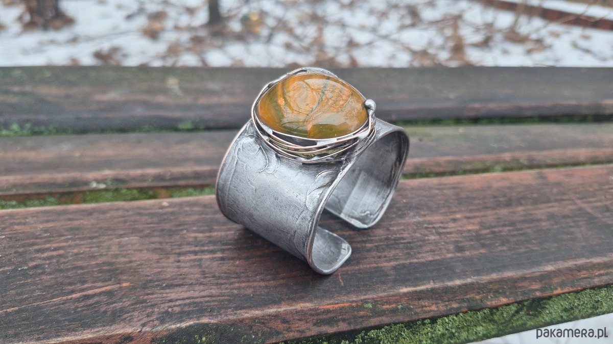 Bransoletka wykonana z miedzi, cyny i szkła. Szerokość 4 cm. Regulowana.