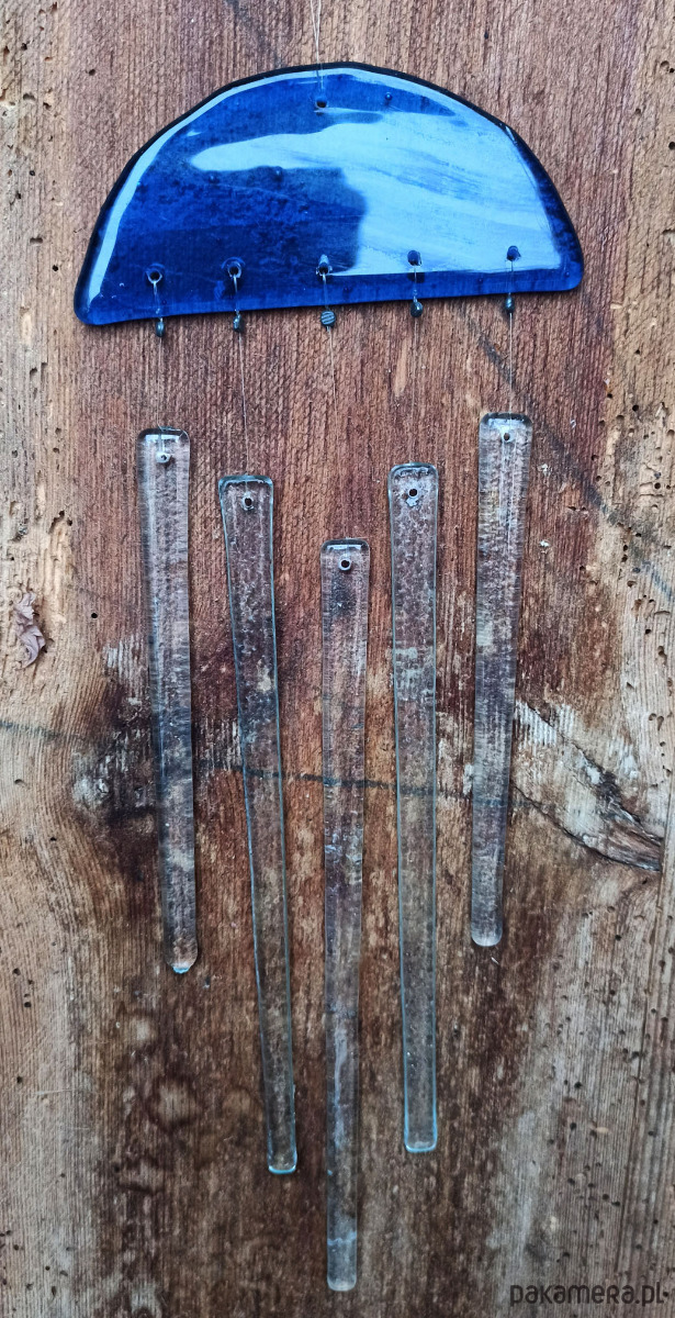 Szklana dekoracja w formie chmurki, do zawieszenia w oknie, na ganku lub tarasie. Wygląda bardzo efektownie w promieniach słońca, a poruszone wiatrem szklane patyczki przyjemnie dźwięczą. Wymiary ok.12x35cm