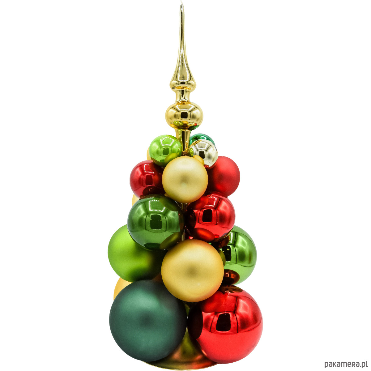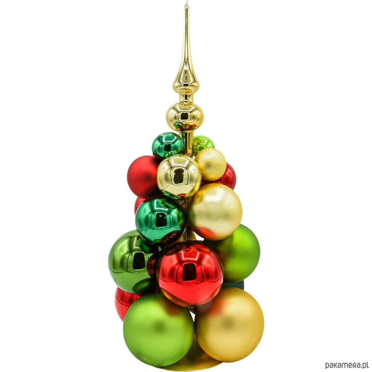 • Konstrukcja: stabilna, stojąca kompozycja bombek osadzonych na osi; całość zakończona złotym czubkiem.